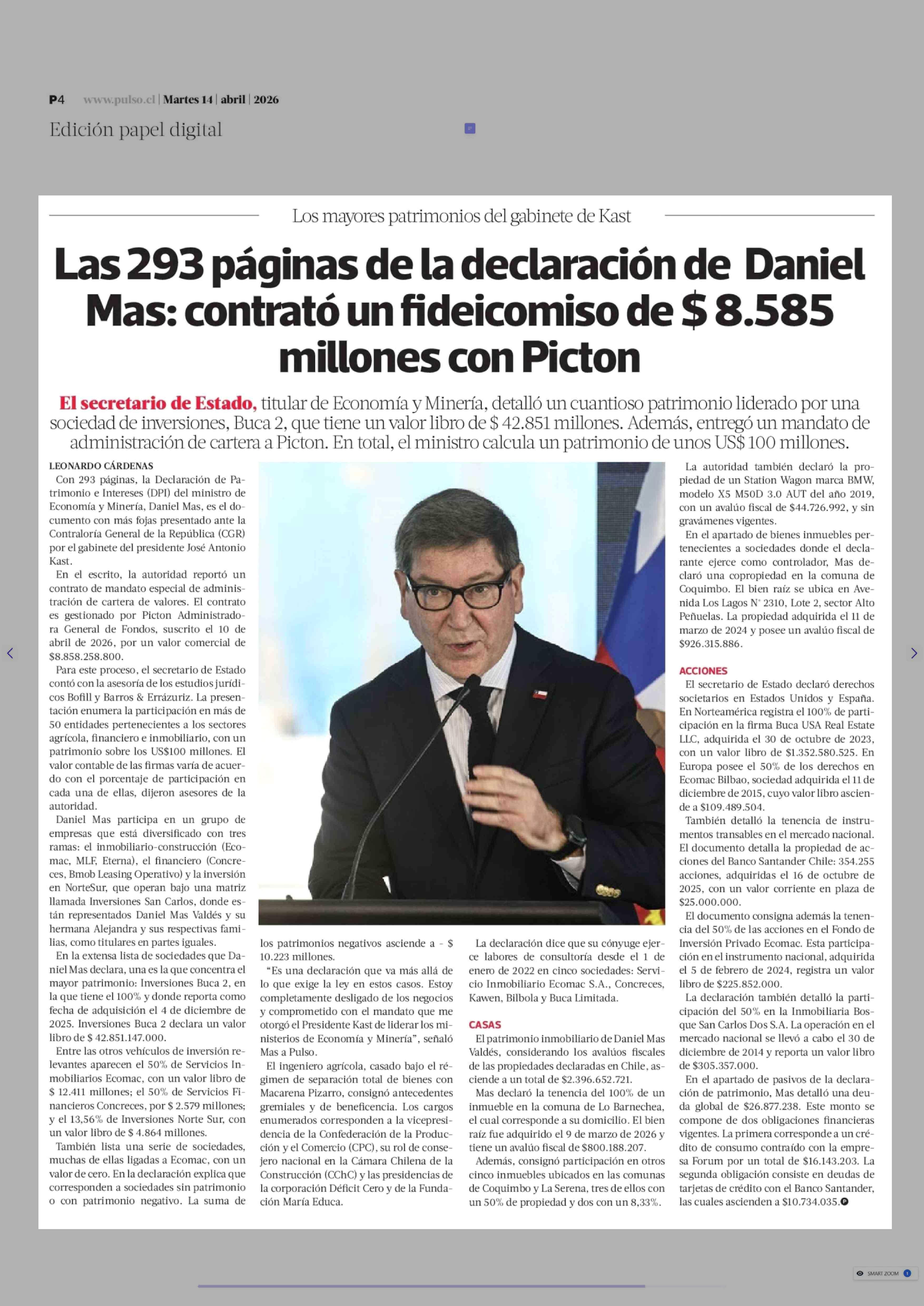 Las 293 páginas de la declaración de Daniel Mas: contrató un fideicomiso de $ 8.585 millones con Picton 14-04-2026 La Tercera |
