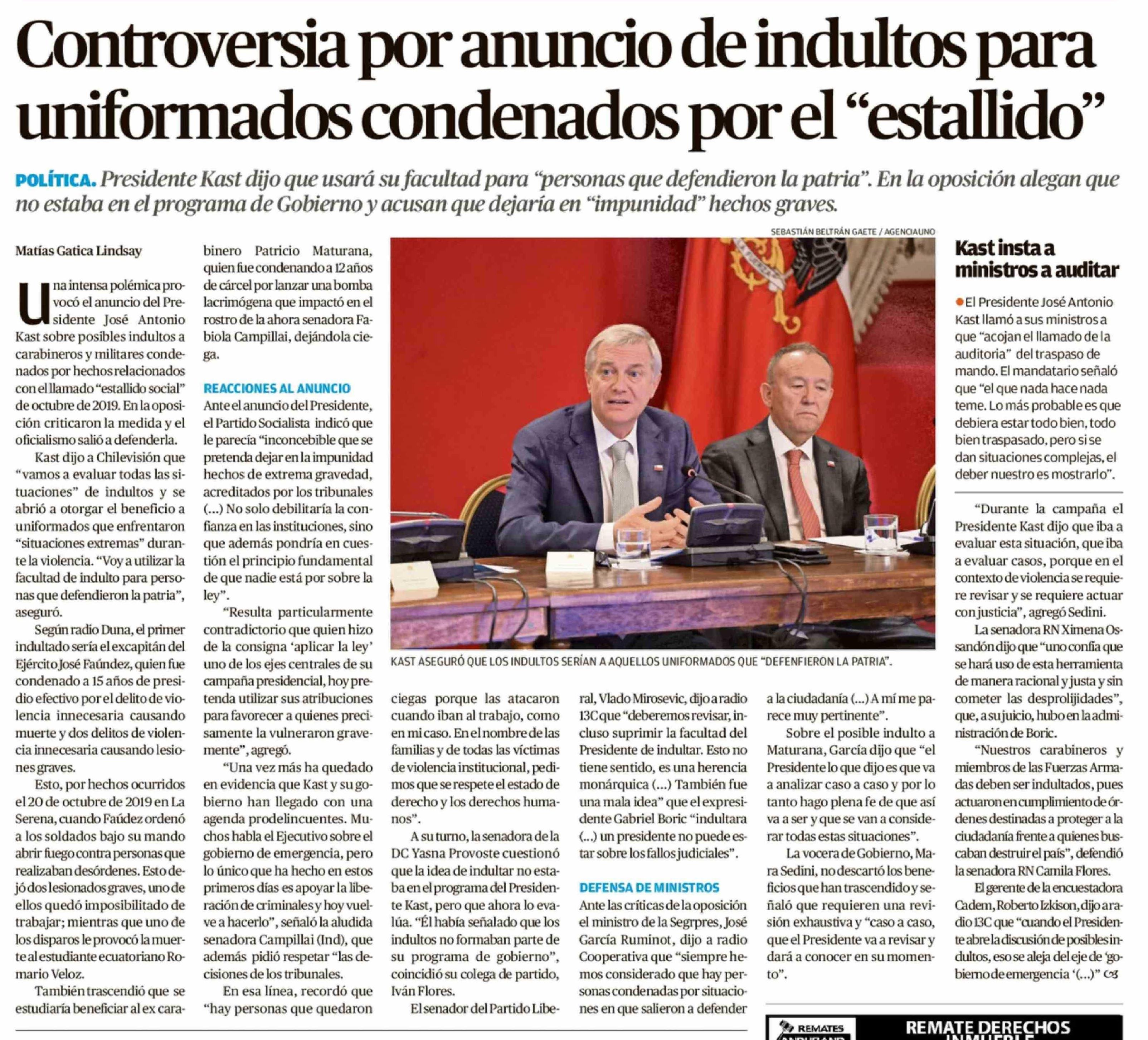 Título: Controversia por anuncio de indultos para uniformados condenados por el "estallido"