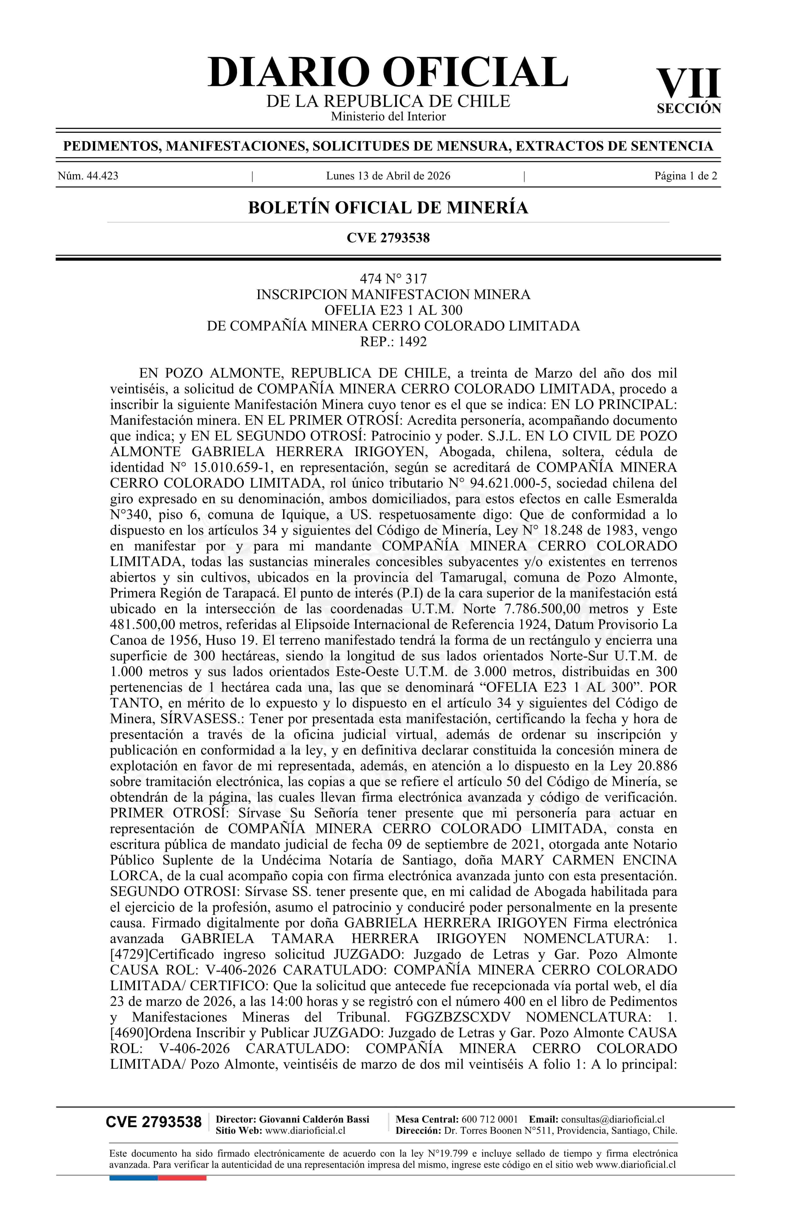 OFELIA E23 1 AL 300 / Compañía Minera Cerro Colorado Limitada 13-04-2026 DIARIO OFICIAL CHILE - BOLETÍN OFICIAL DE MINERÍA |