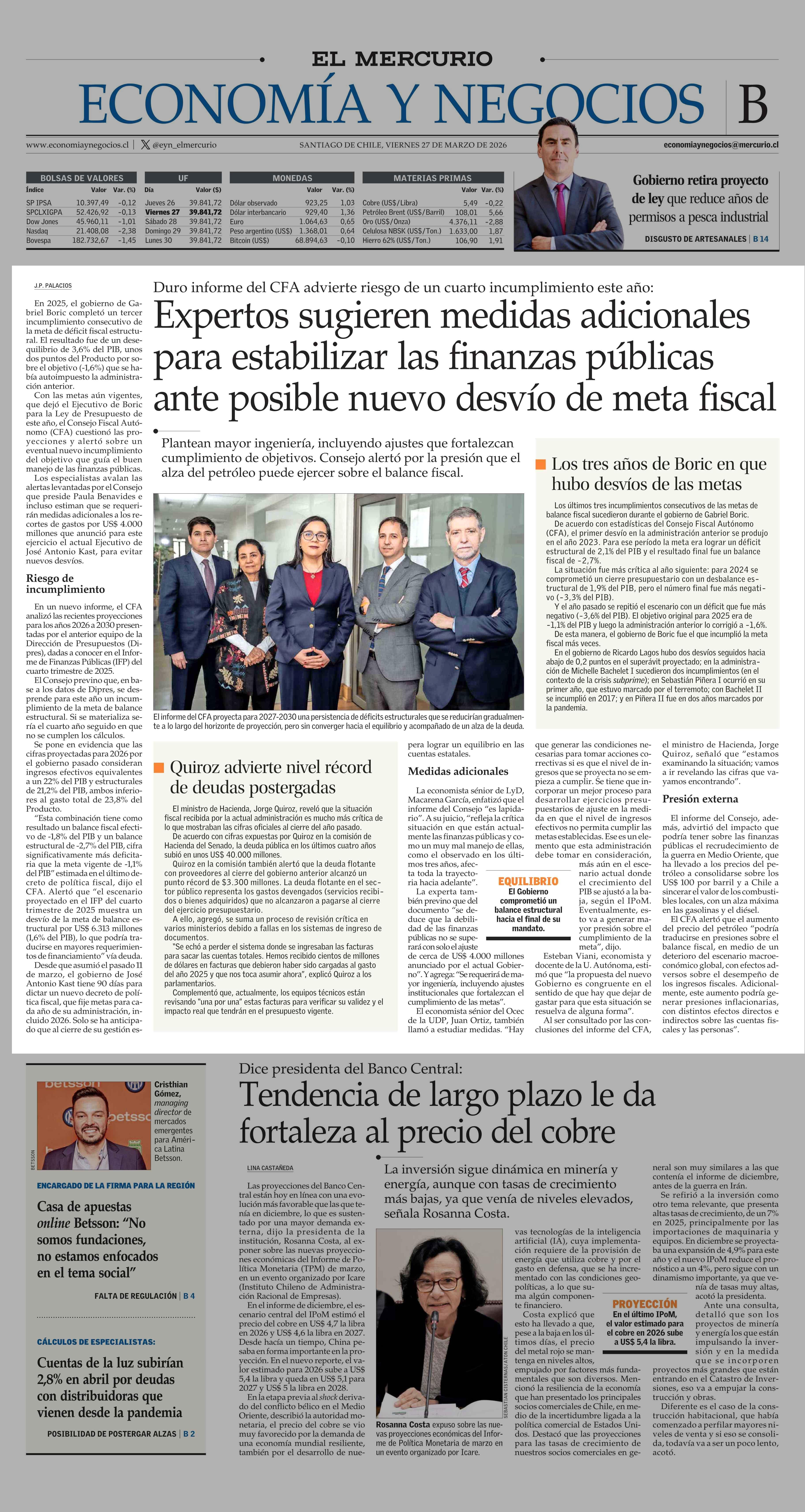 Expertos sugieren medidas adicionales para estabilizar las finanzas públicas ante posible nuevo desvío de meta fiscal 27-03-2026 El Mercurio |