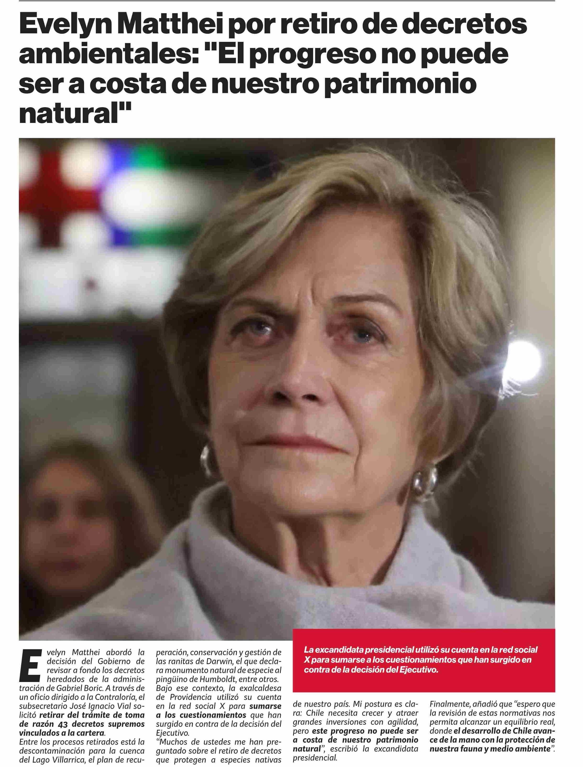 Título: Evelyn Matthei por retiro de decretos ambientales: "El progreso no puede ser a costa de nuestro patrimonio natural"