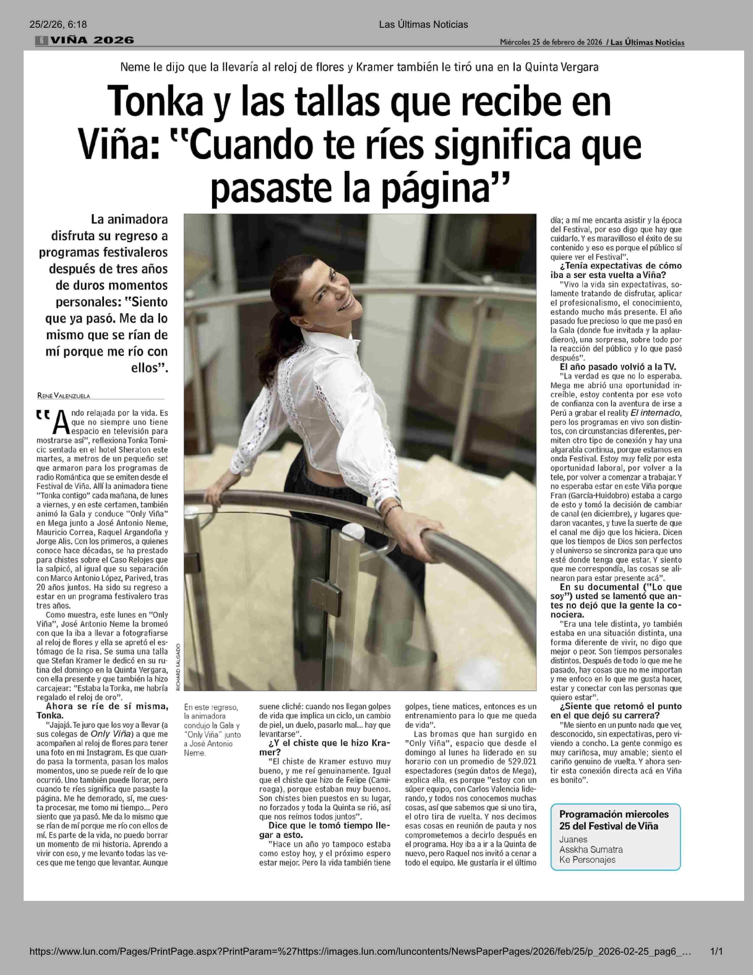 Tonka y las tallas que recibe en Viña: “Cuando te ríes significa que pasaste la página” 25-02-2026 Las Últimas Noticias |