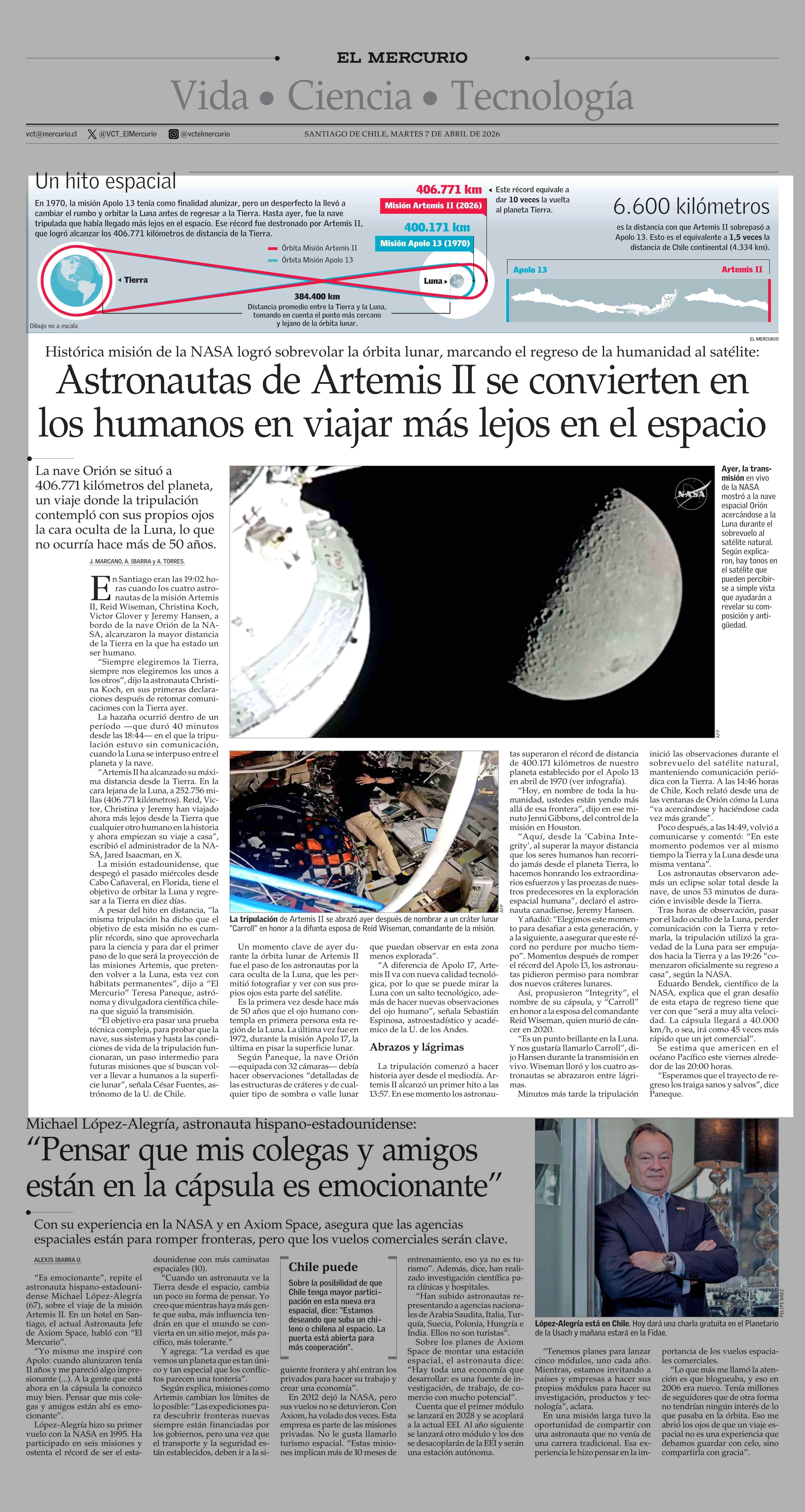 Astronautas de Artemis II se convierten en los humanos en viajar más lejos en el espacio 07-04-2026 El Mercurio |