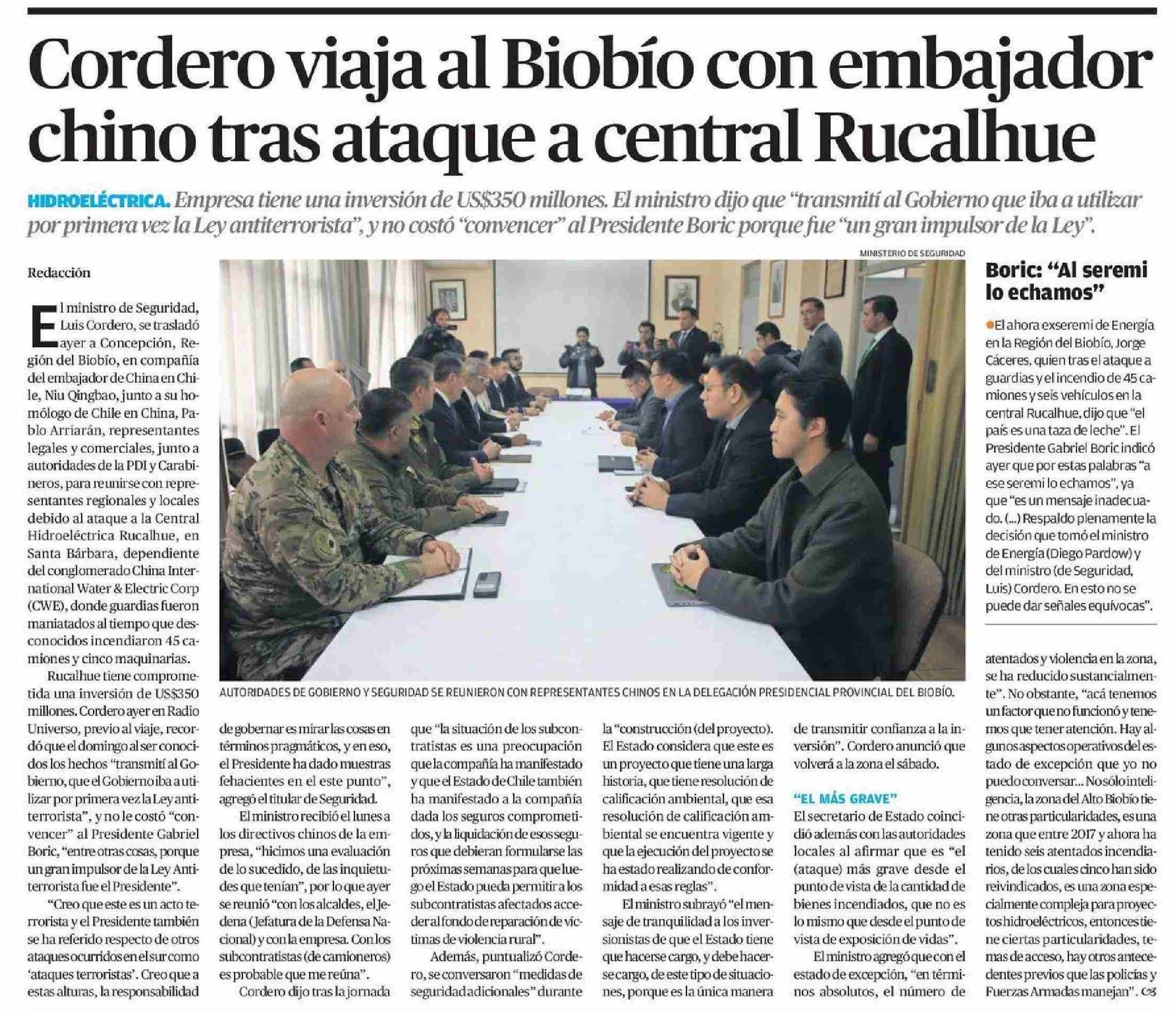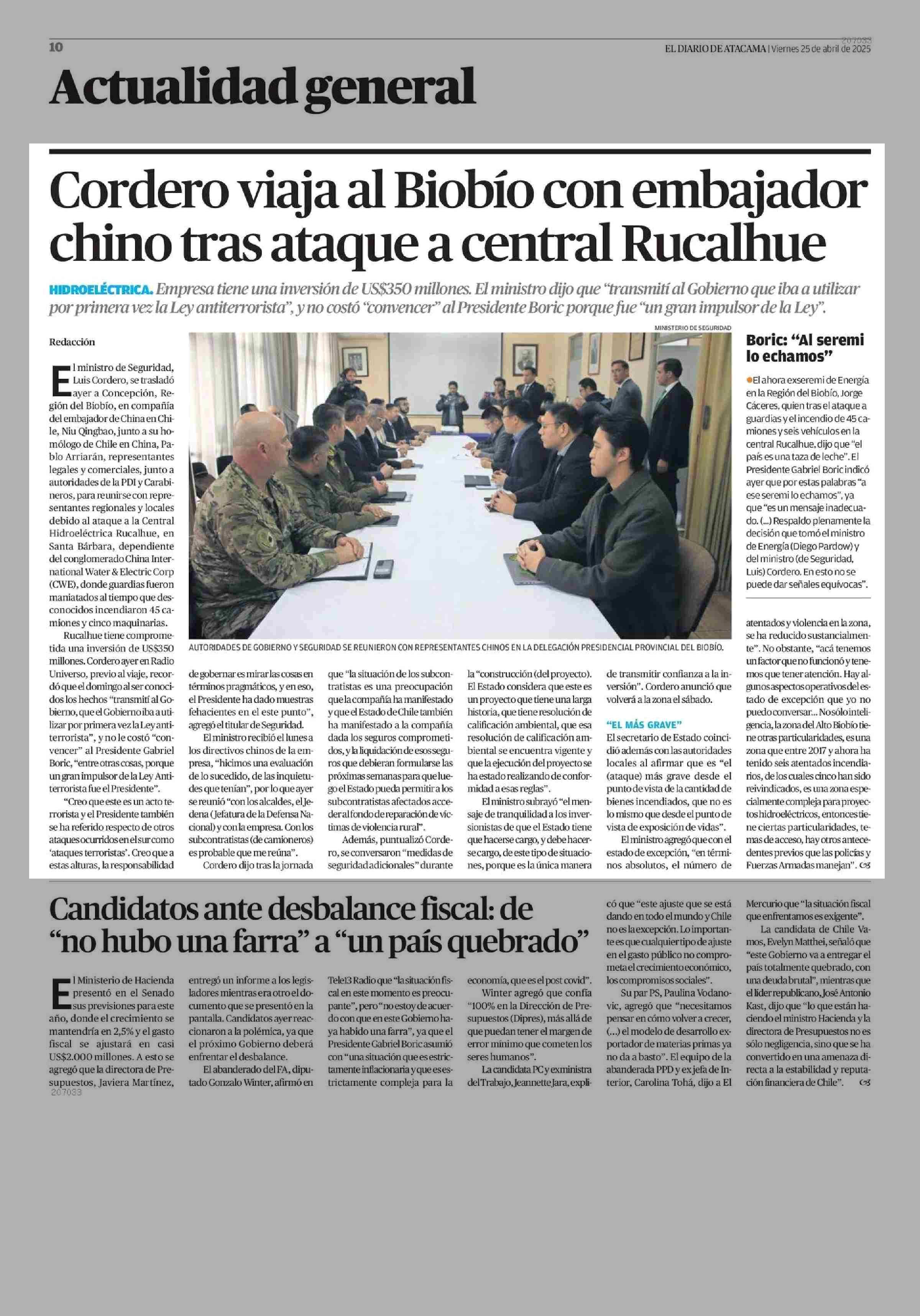 Cordero viaja al Biobío con embajador chino tras ataque a central Rucalhue 25-04-2025 El Diario de Atacama |