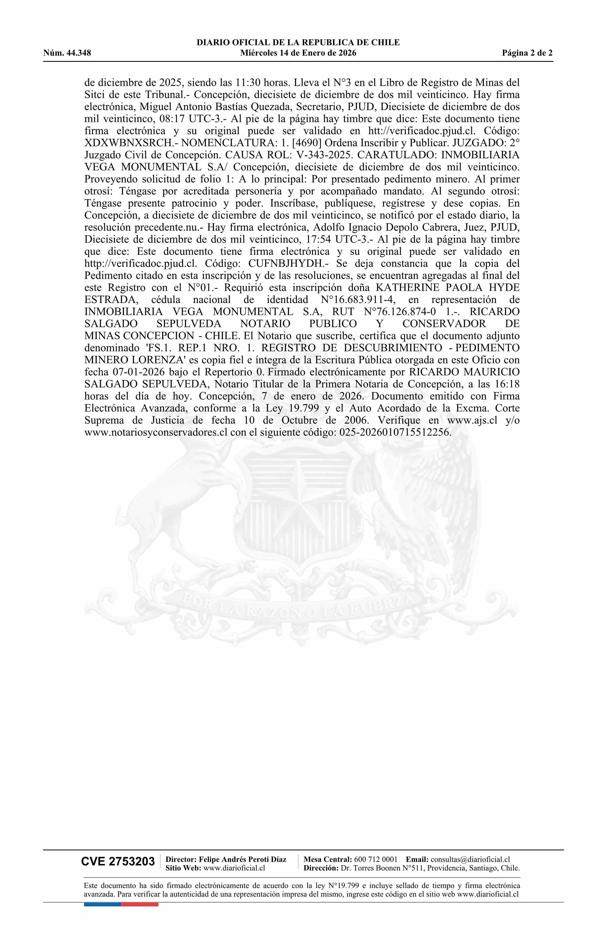LORENZA / Inmobiliaria Vega Monumental S.A. 14-01-2026 DIARIO OFICIAL CHILE - BOLETÍN OFICIAL DE MINERÍA |