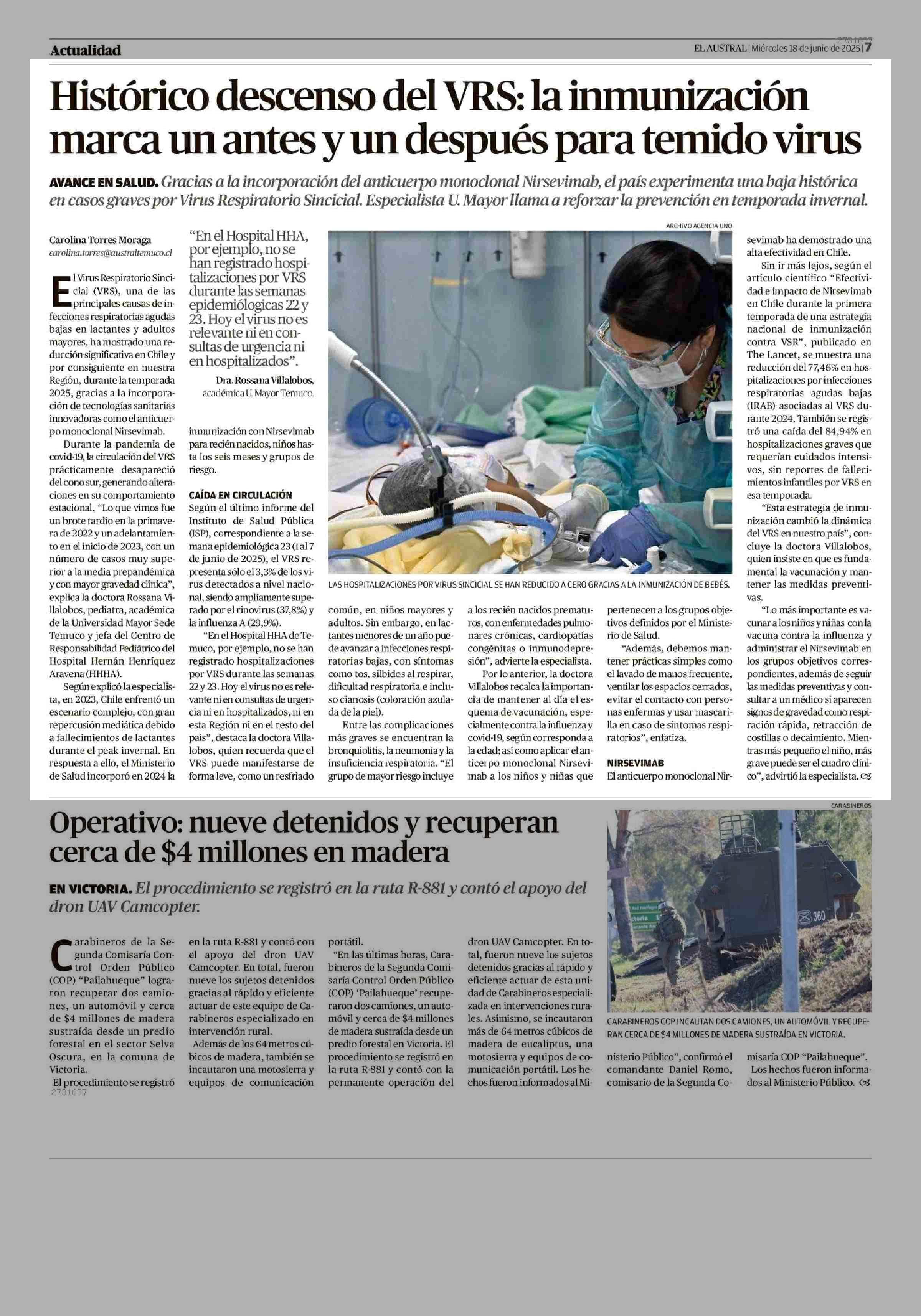 Histórico descenso del VRS: la inmunización marca un antes y un después para temido virus 18-06-2025 El Austral de la Araucanía |