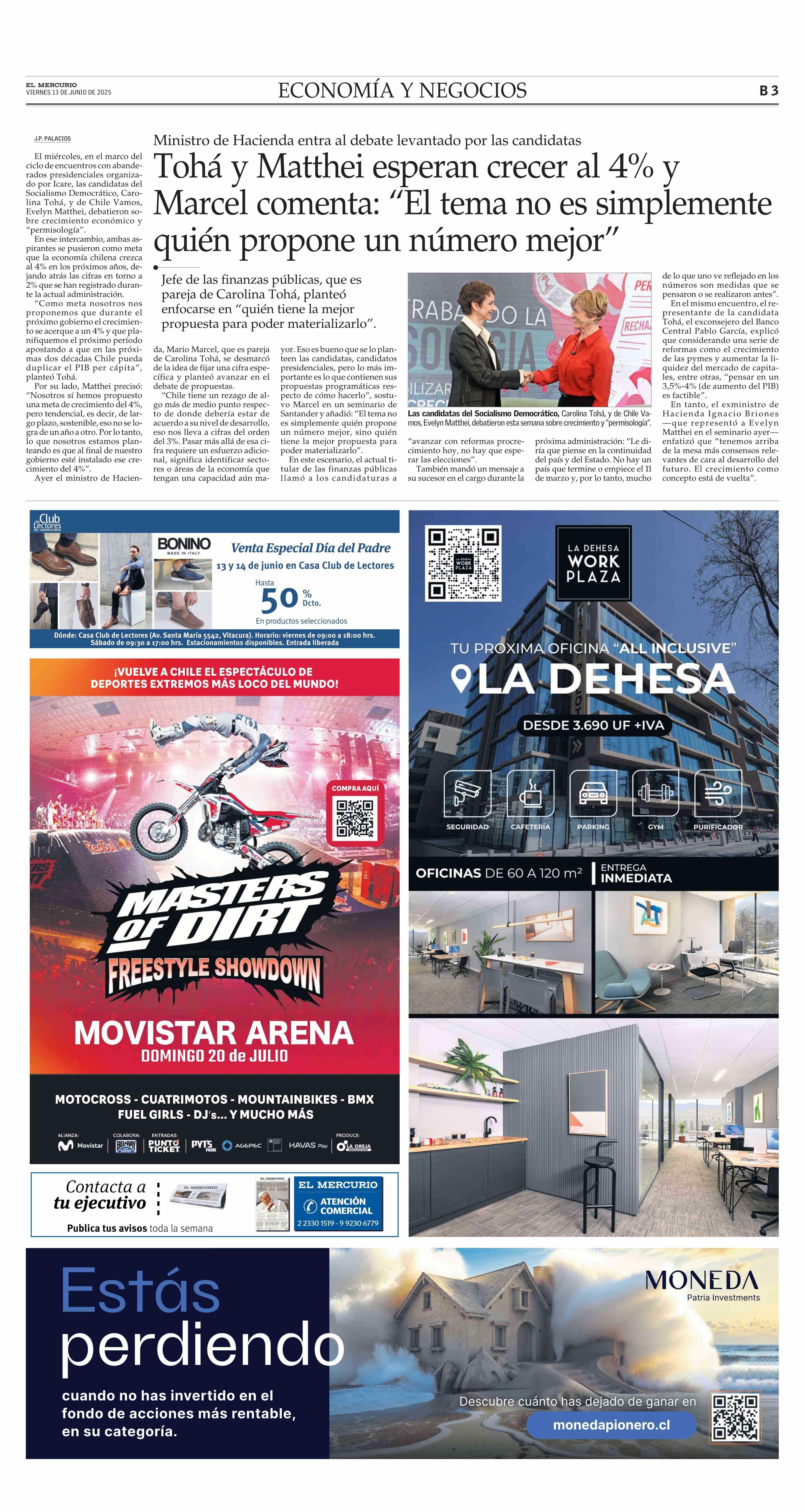 Tohá y Matthei esperan crecer al 4% y Marcel comenta: “El tema no es simplemente quién propone un número mejor” 13-06-2025 El Mercurio |