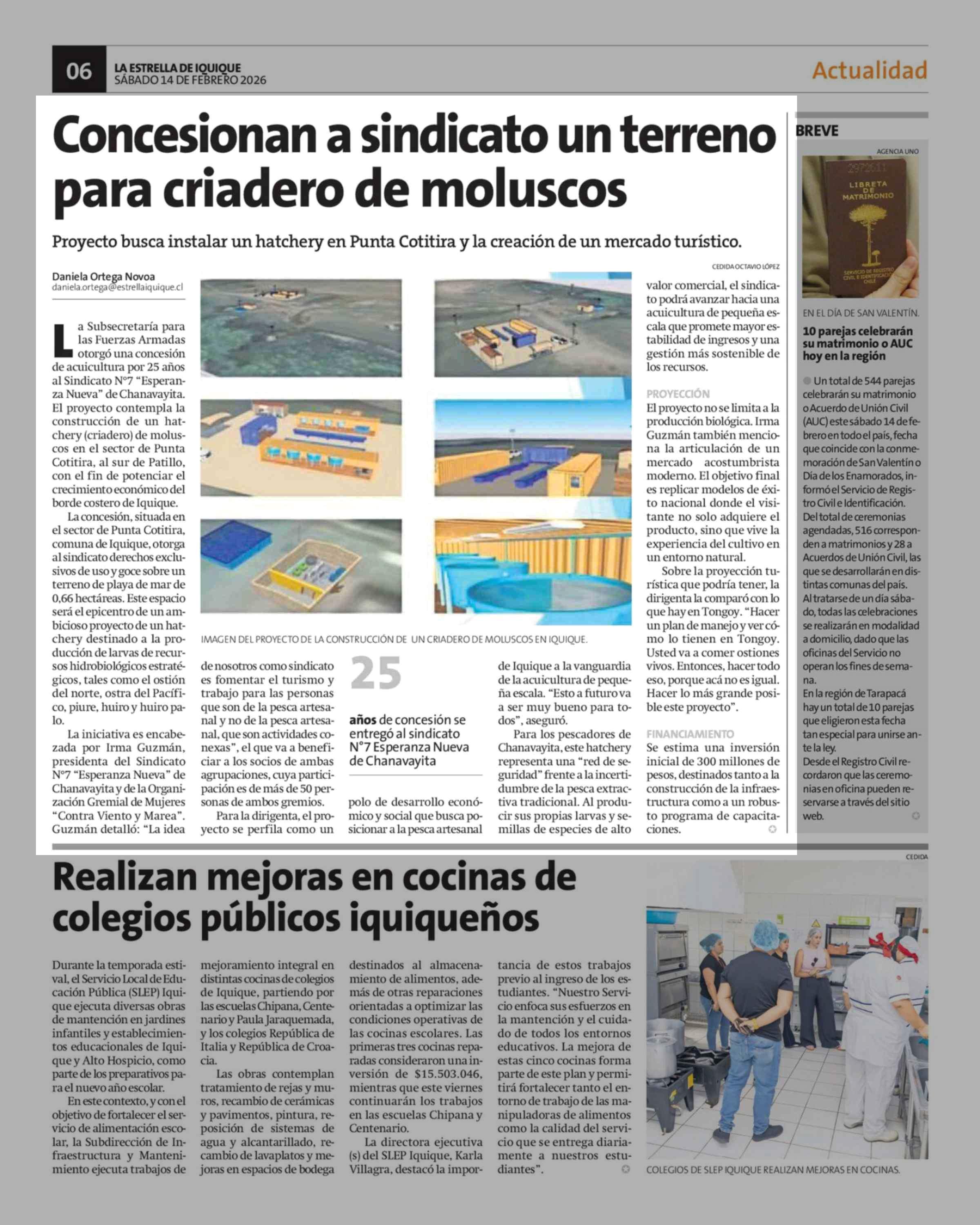 Concesionan a sindicato un terreno para criadero de moluscos 14-02-2026 La Estrella de Iquique |