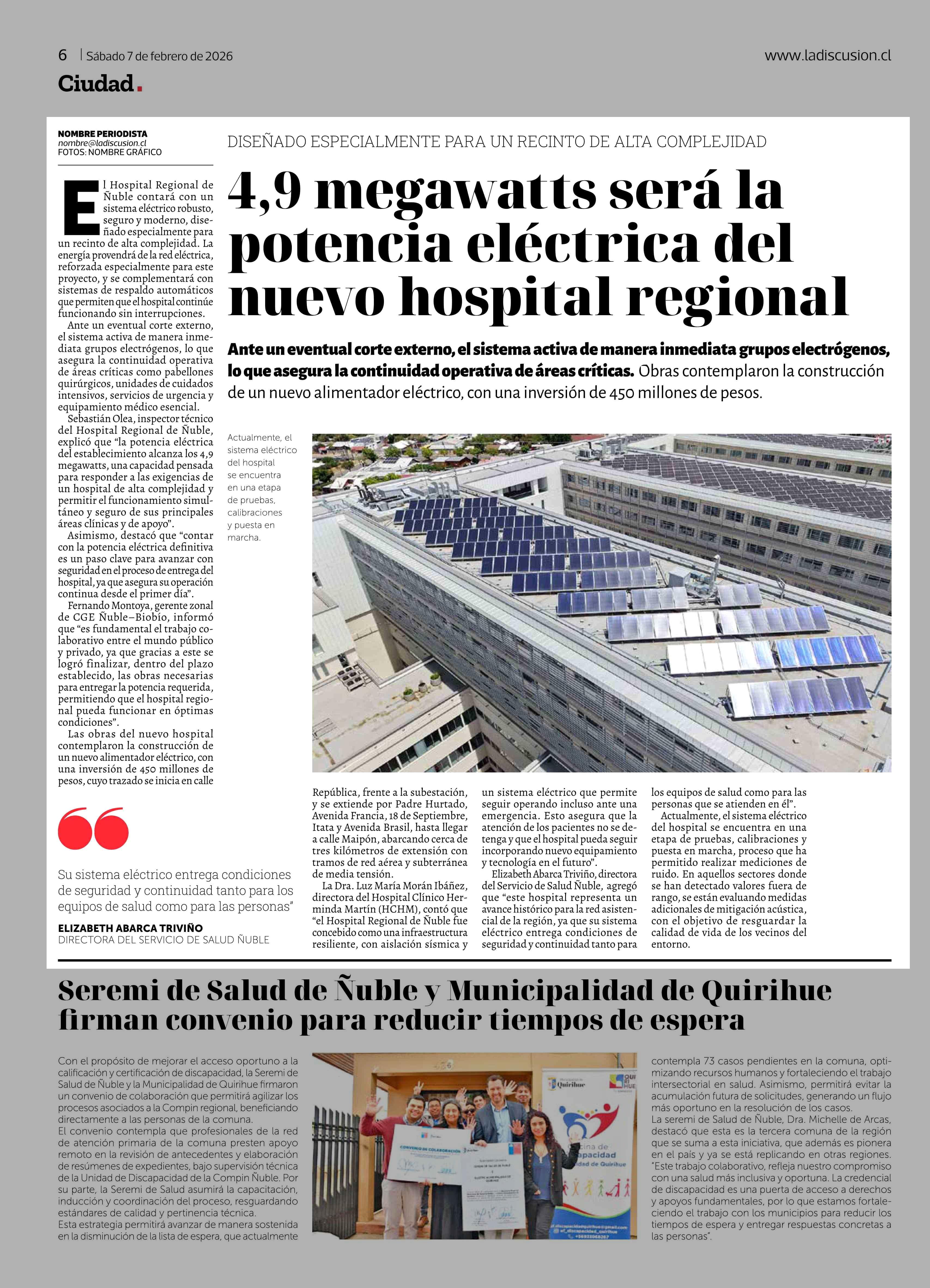 4,9 Megawatts será la potencia eléctrica del nuevo hospital regional 07-02-2026 La Discusión |