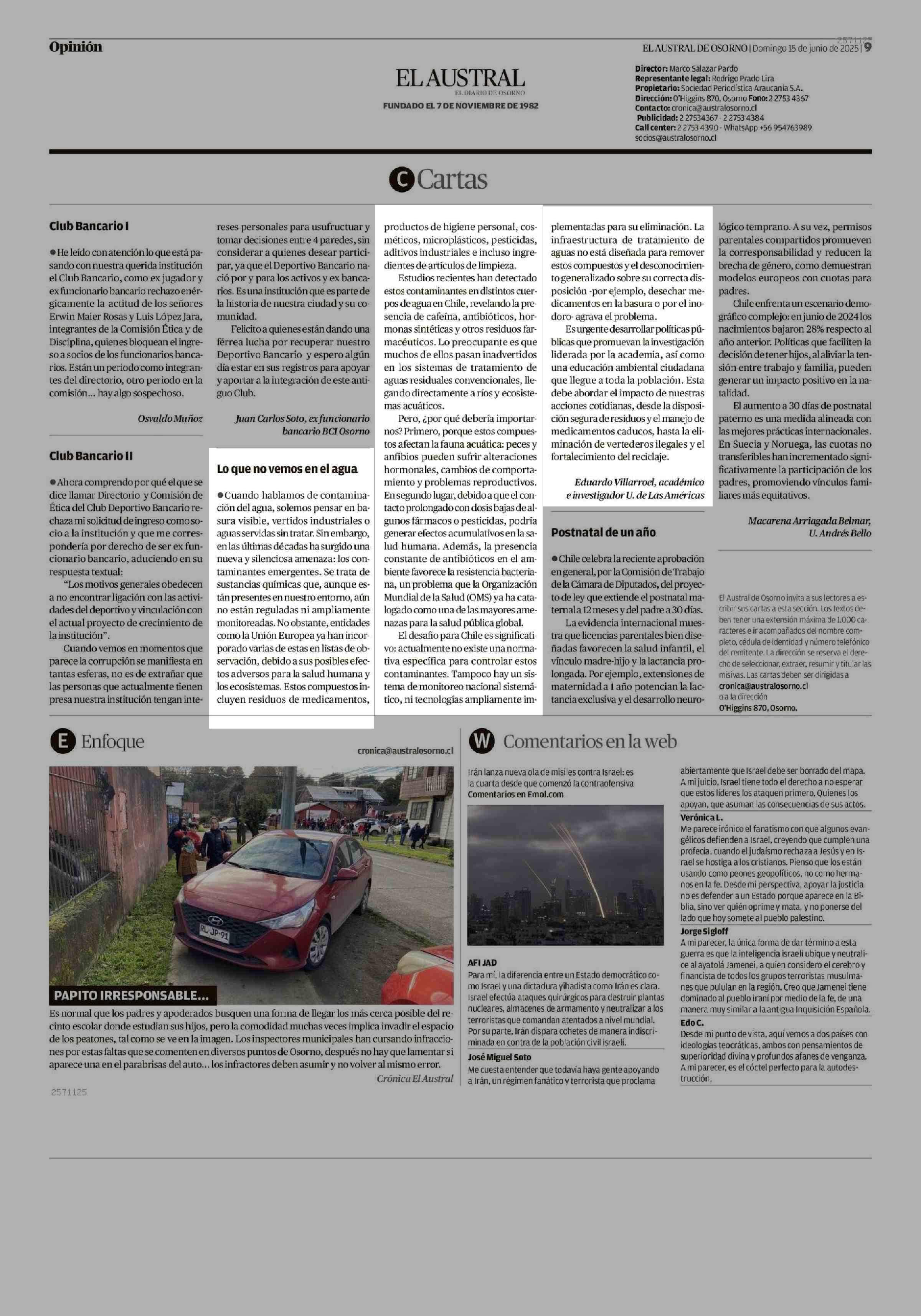 CARTAS: Lo que no vemos en el agua 15-06-2025 El Austral de Osorno |