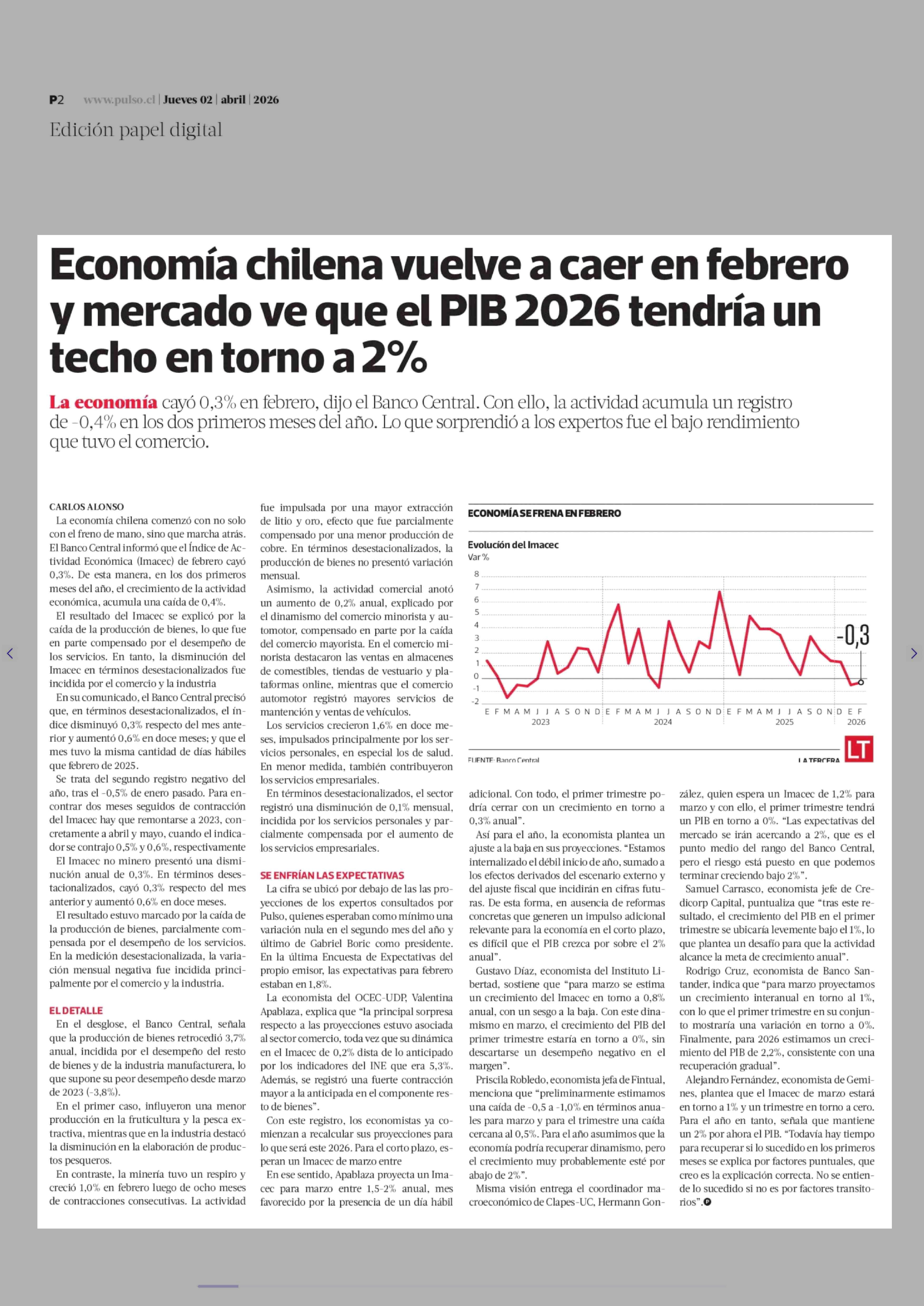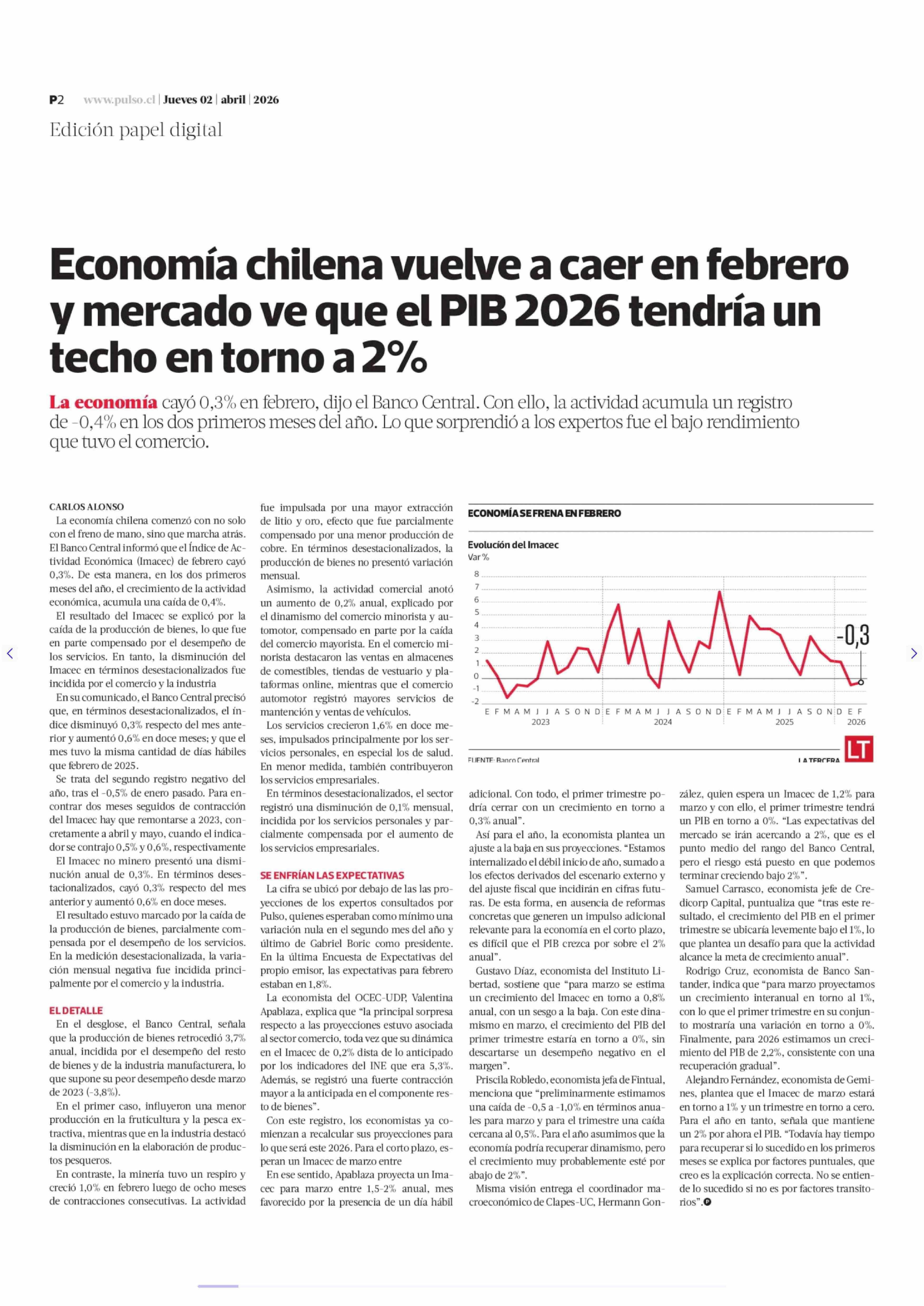 Título: Economía chilena vuelve a caer en febrero y mercado ve que el PIB 2026 tendría un techo en torno a 2%