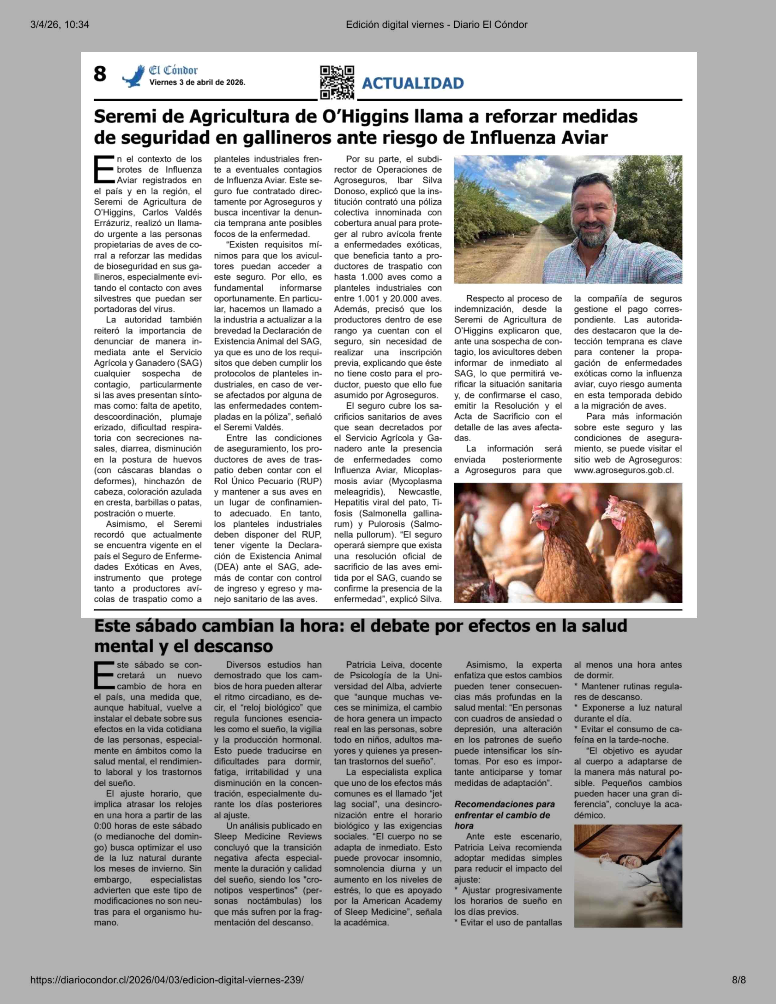 Seremi de Agricultura de O'Higgins llama a reforzar medidas de seguridad en gallineros ante riesgo de Influenza Aviar 03-04-2026 Diario El Cóndor |