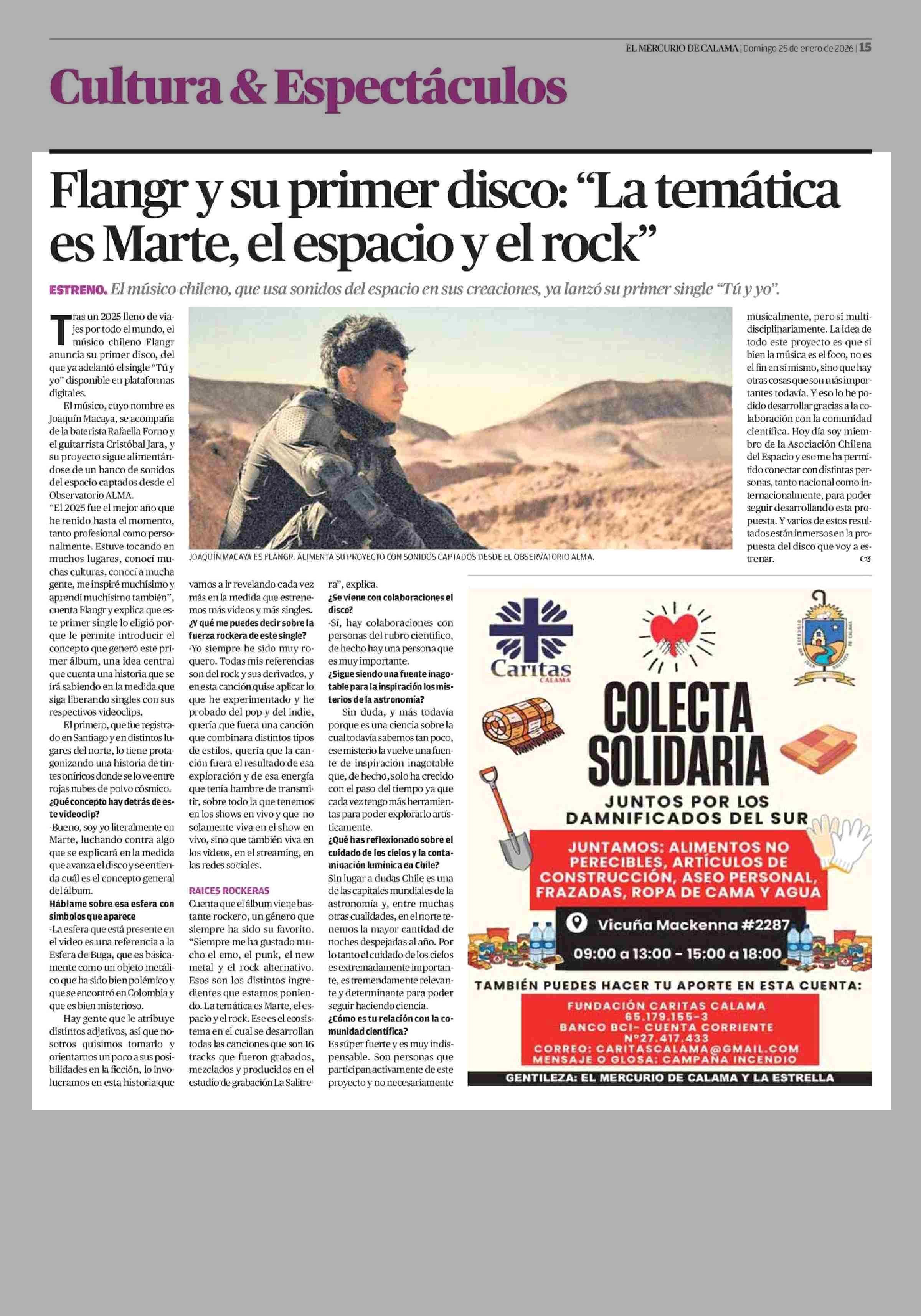 Flangr y su primer disco: "La temática es Marte, el espacio y el rock" 25-01-2026 El Mercurio de Calama |