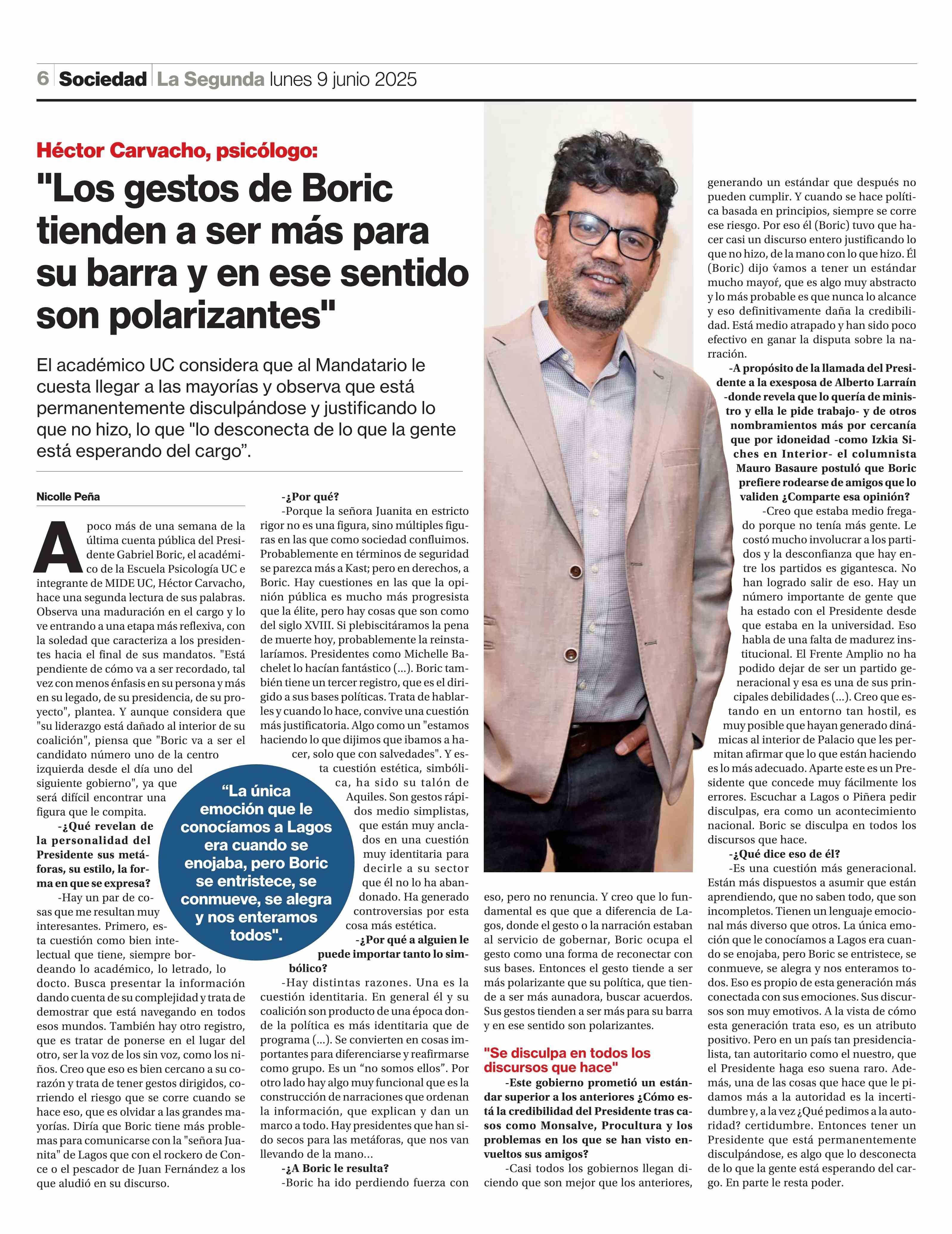 "Los gestos de Boric tienden a ser más para su barra y en ese sentido son polarizantes” 09-06-2025 La Segunda |