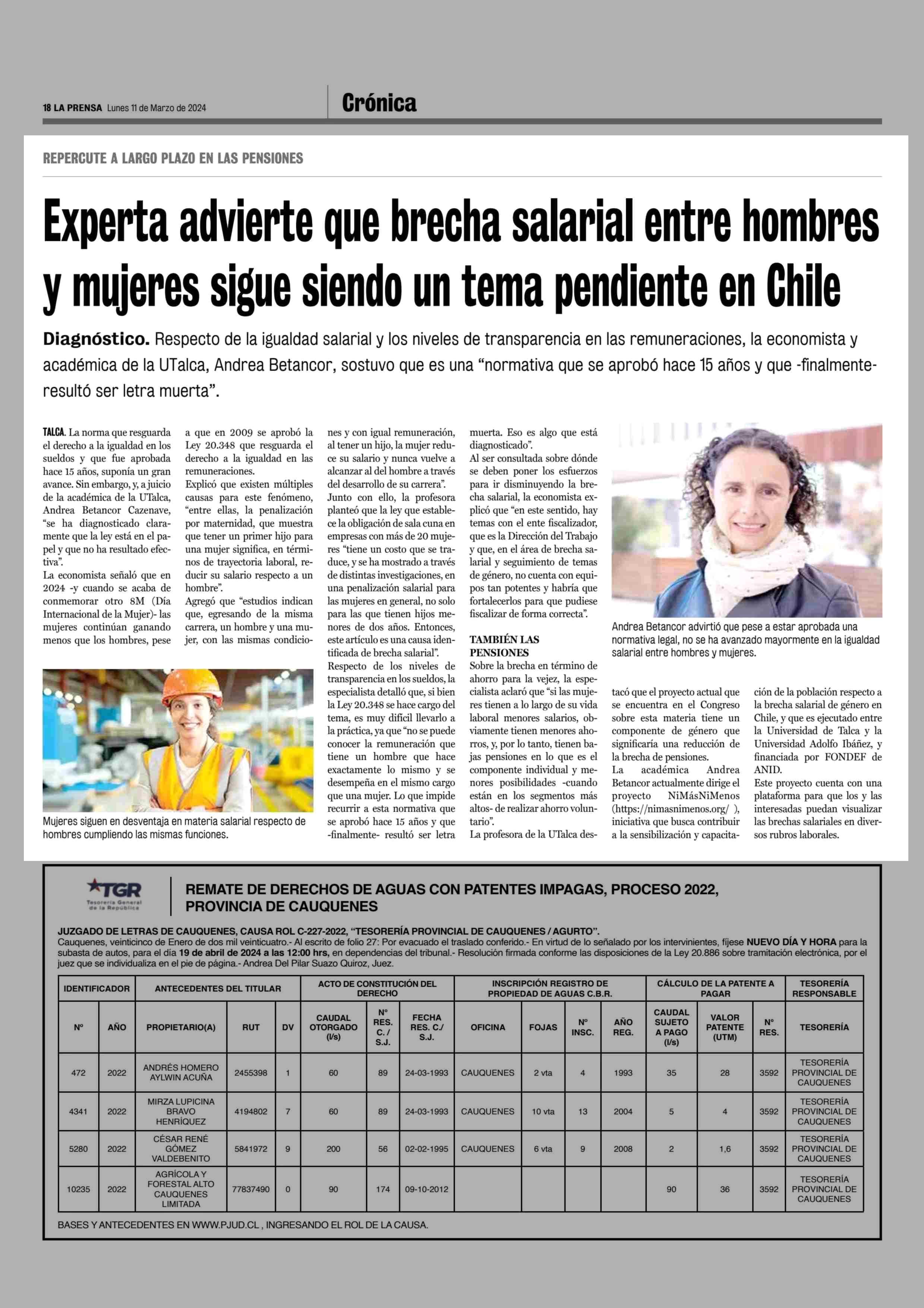 Experta advierte que brecha salarial entre hombres y mujeres sigue siendo un tema pendiente en Chile 11-03-2024 La Prensa de Curicó |