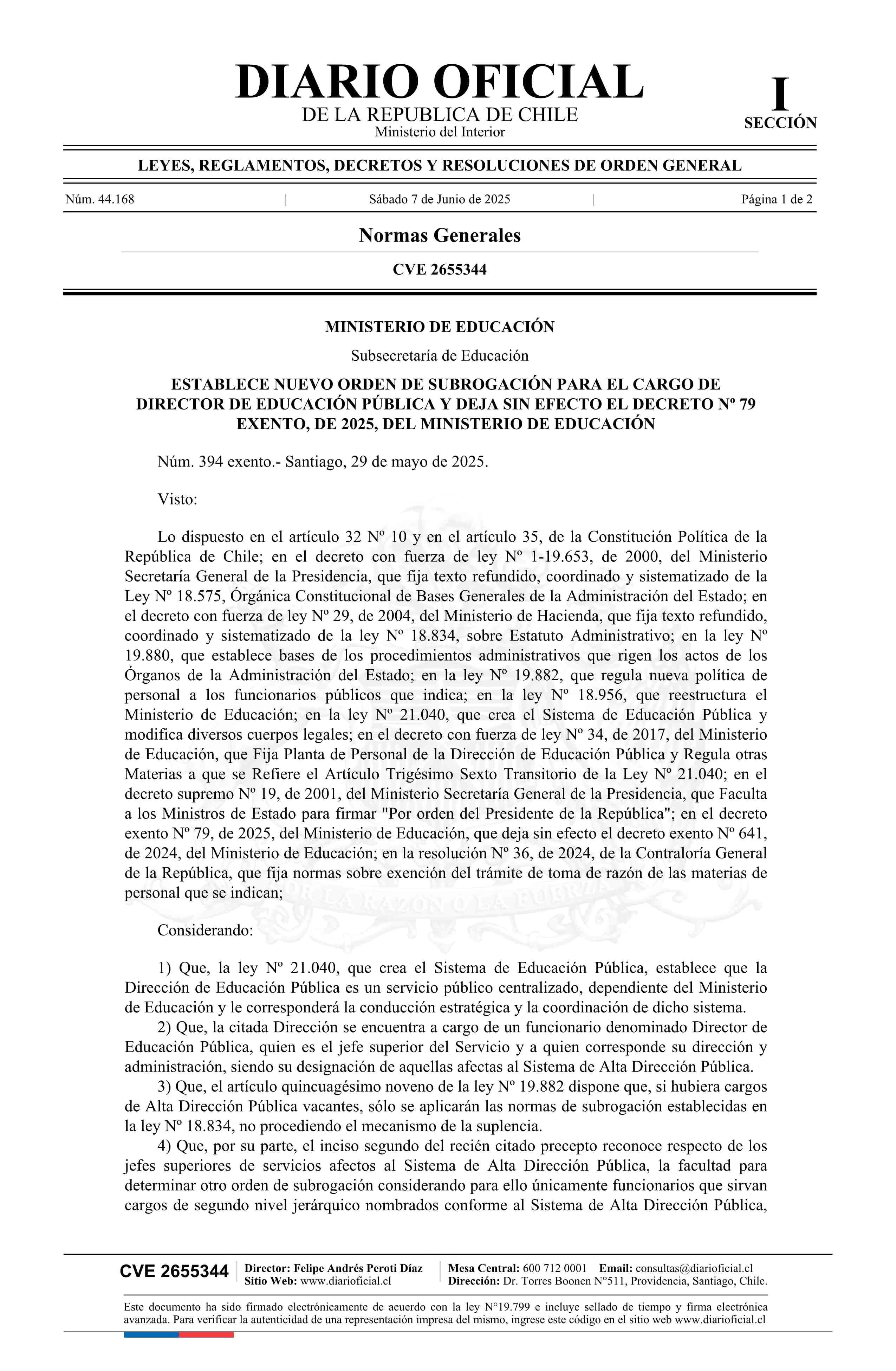 Decreto exento número 394, de 2025.- Establece nuevo orden de subrogación para el cargo de Director de Educación Pública y deja sin efecto decreto Nº 79 exento, de 2025 07-06-2025 DIARIO OFICIAL CHILE - BOLETÍN OFICIAL DE MINERÍA |