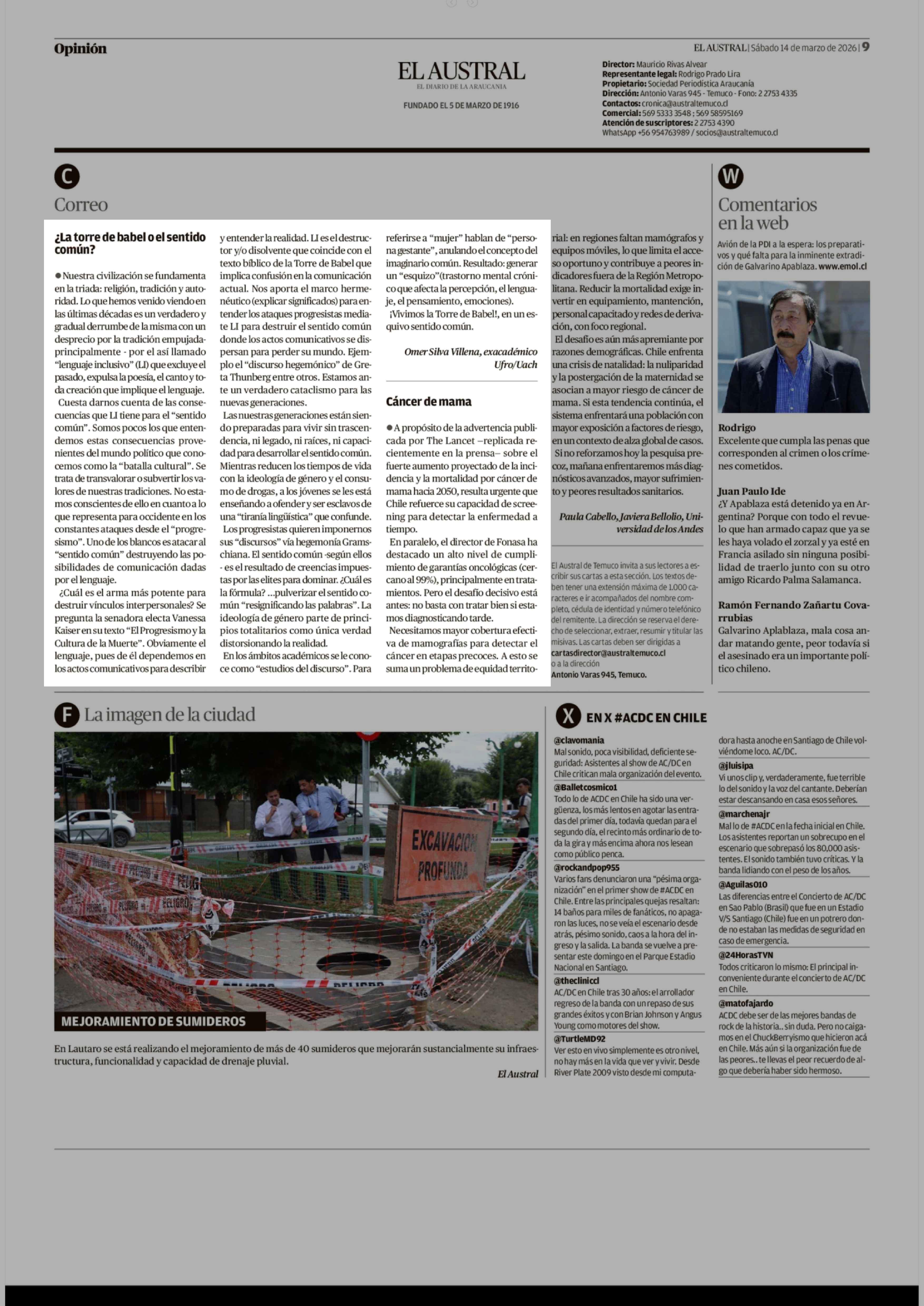 Cartas: ¿La torre de babel o el sentido común? 14-03-2026 El Austral de la Araucanía |
