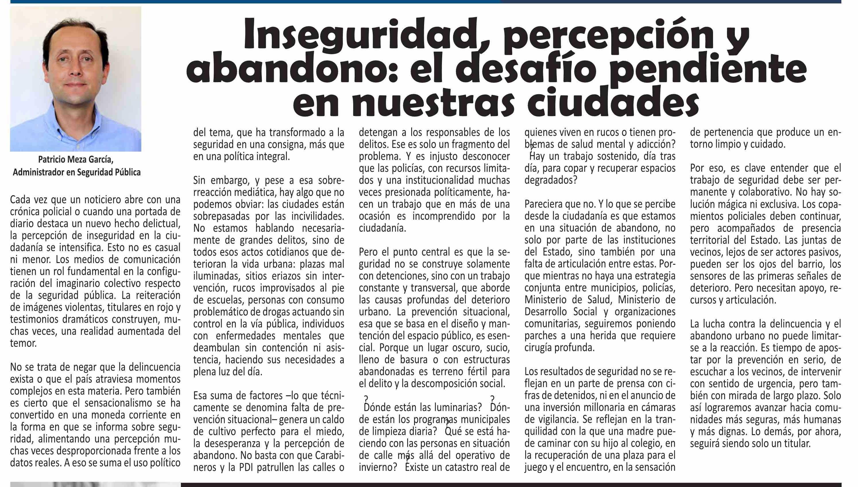 | Título: | Columnas de Opinión: Inseguridad, percepción y abandono: el desafío pendiente en nuestras ciudades |