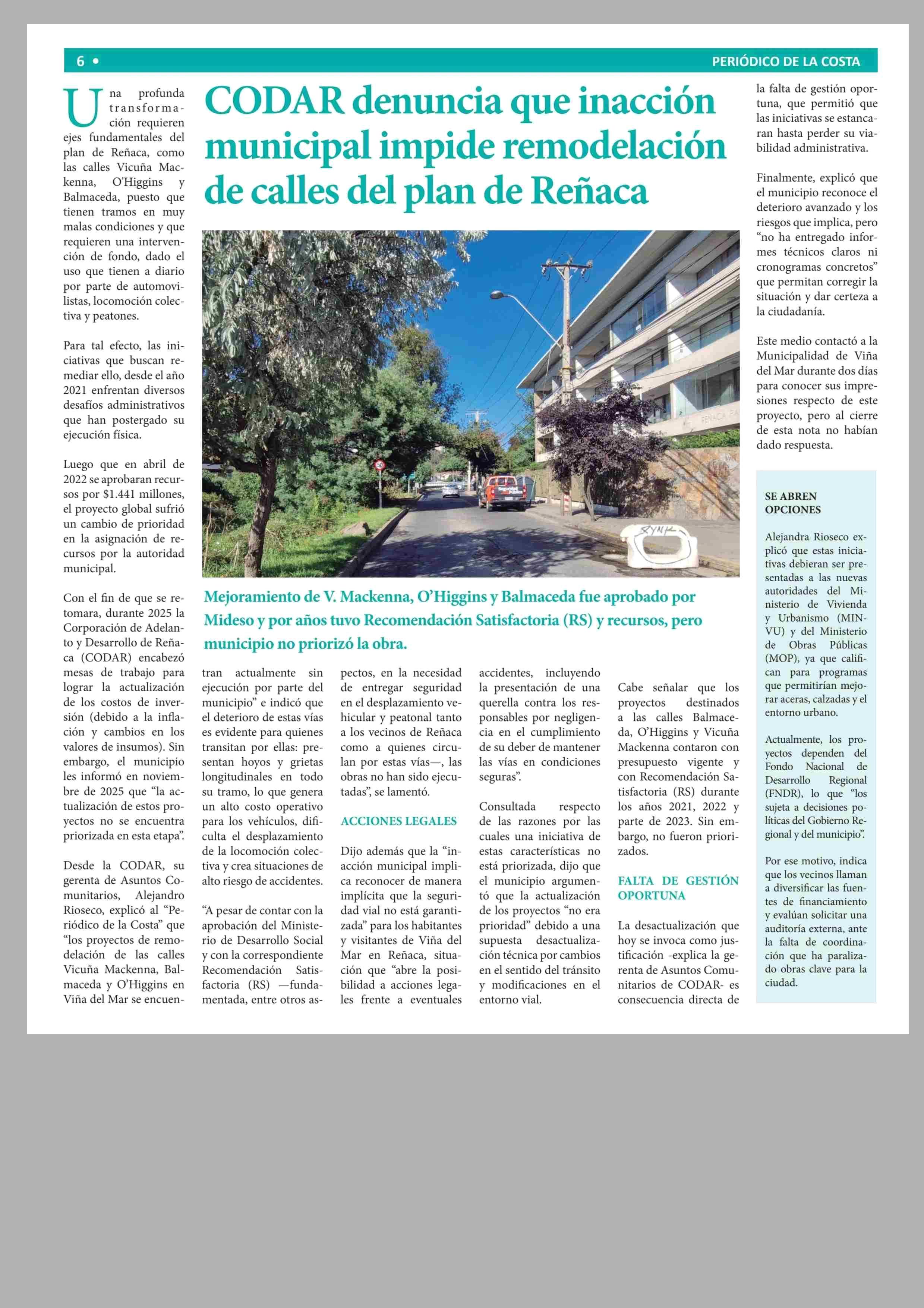 CODAR denuncia que inacción municipal impide remodelación de calles del plan de Reñaca 23-02-2026 Periódico de la Costa |
