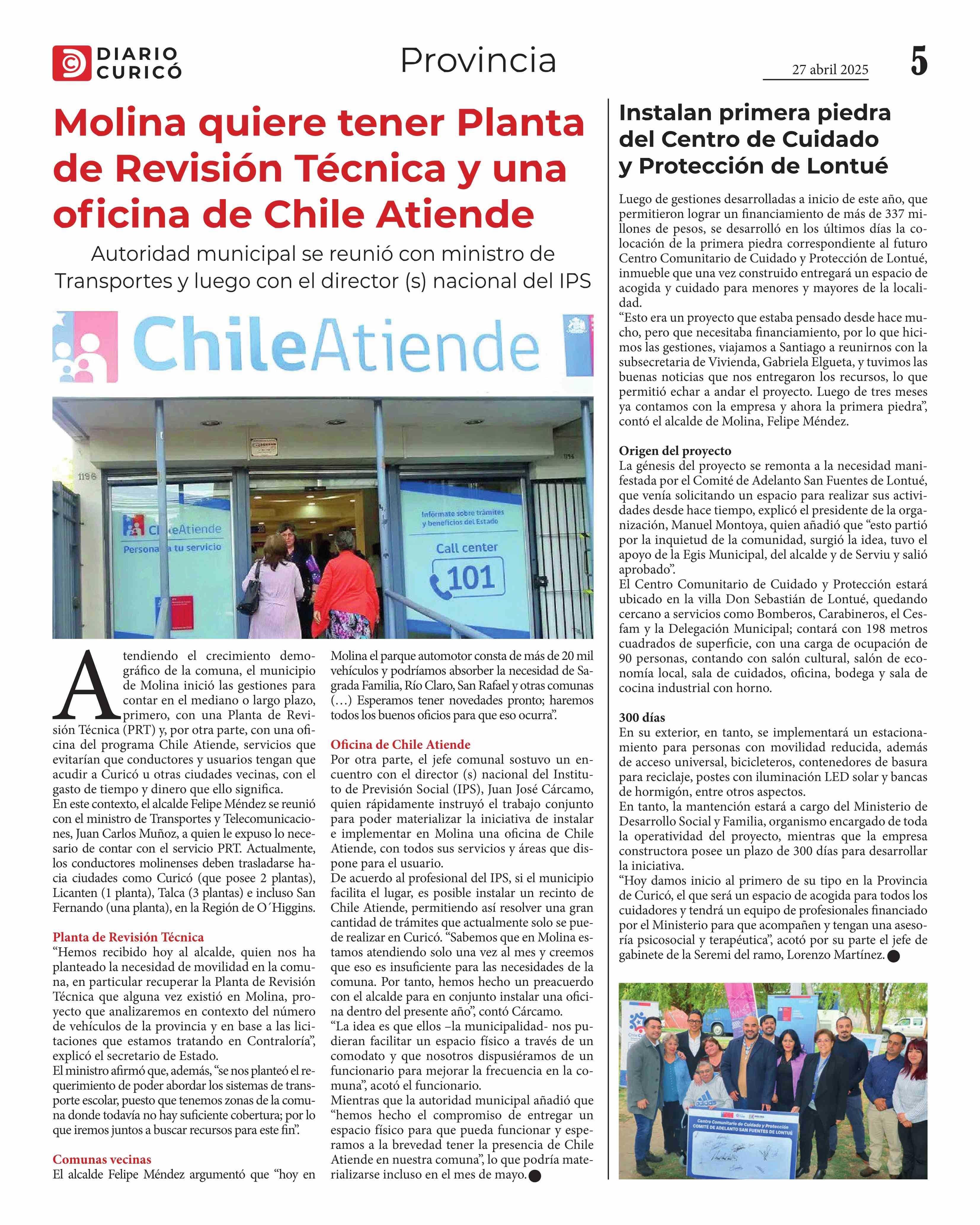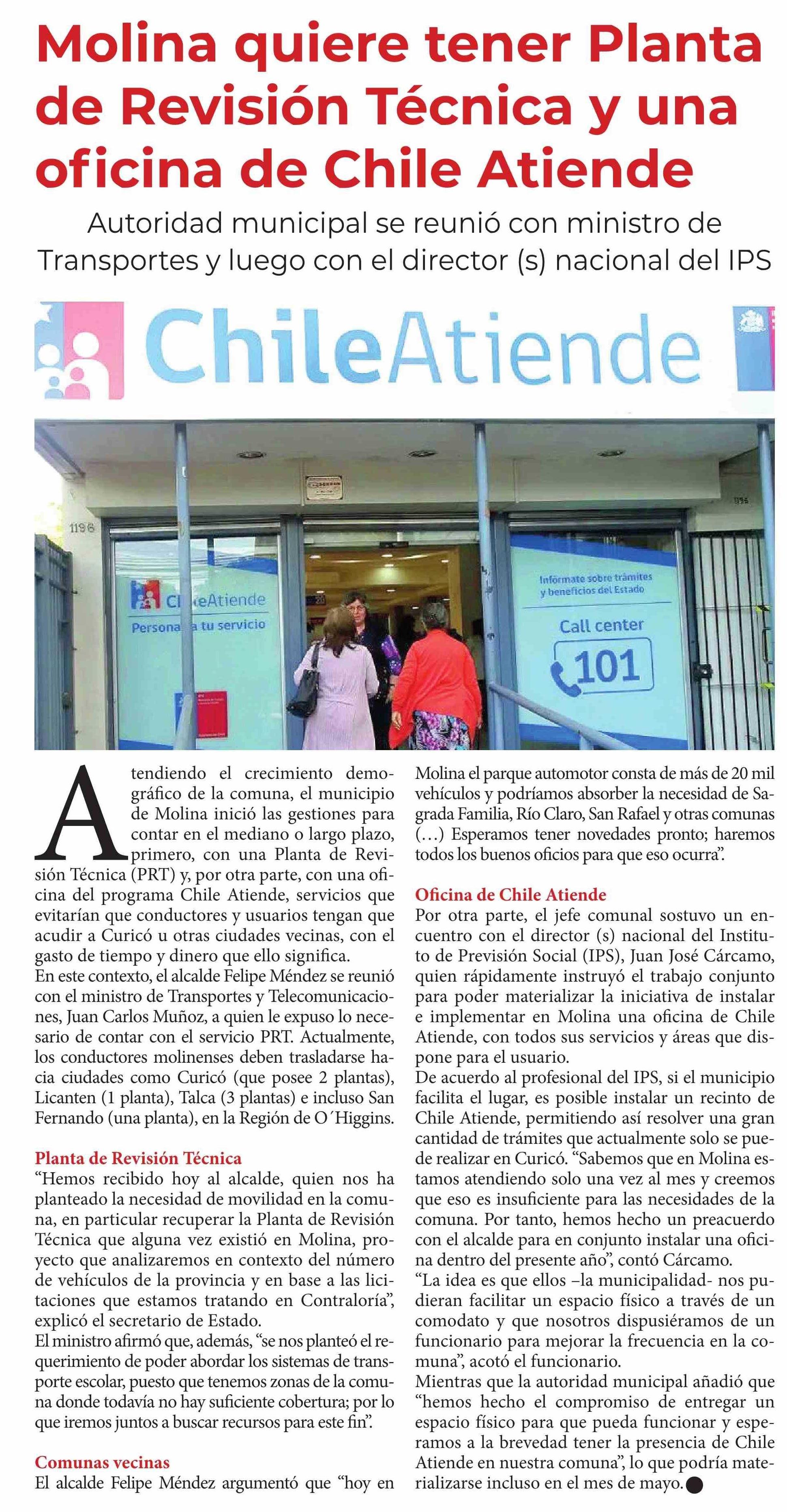 Molina quiere tener Planta de Revisión Técnica y una oficina de Chile Atiende 04-05-2025 Diario Talca |