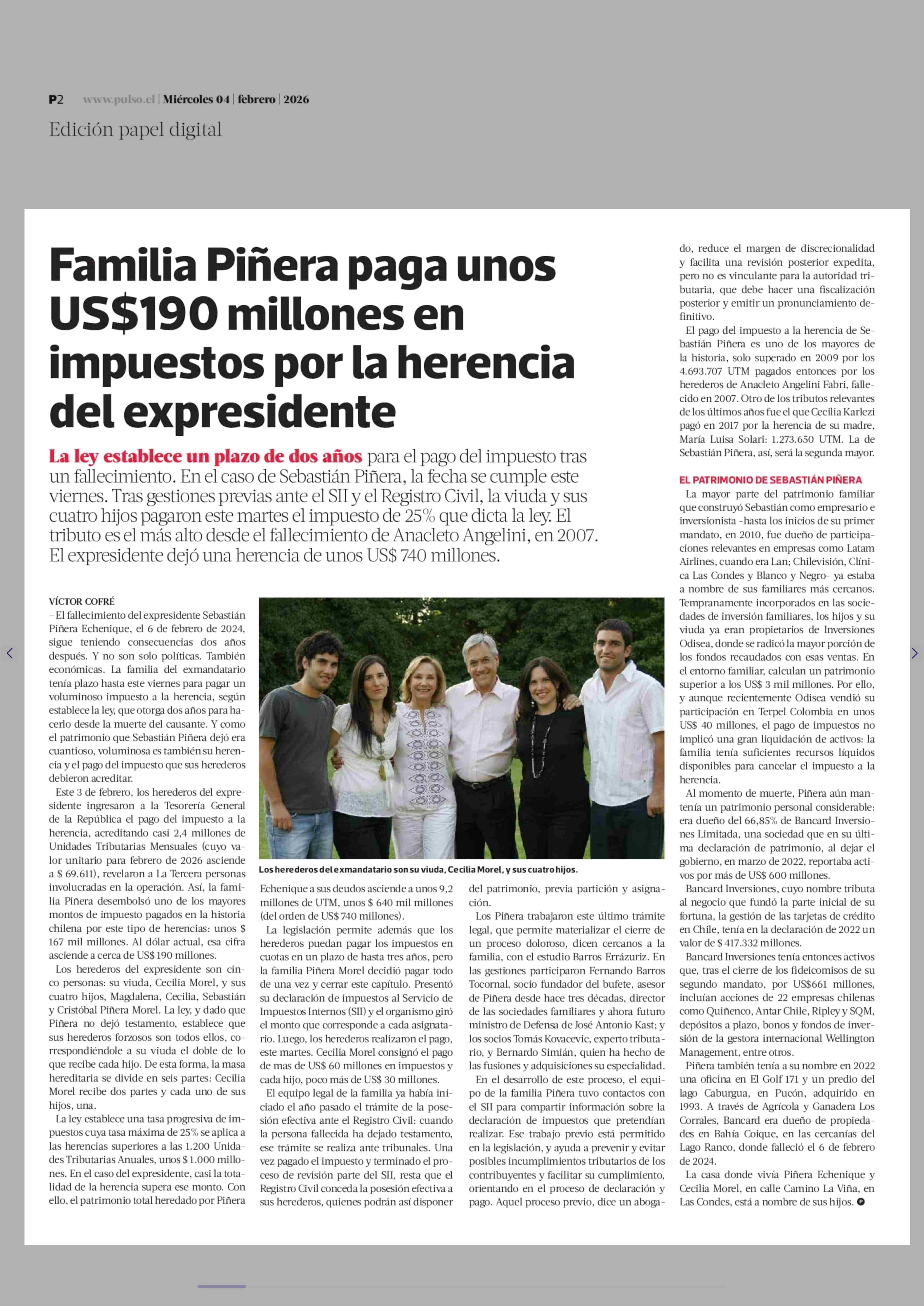 Título: Familia Piñera paga unos US$190 millones en impuestos por la herencia del expresidente