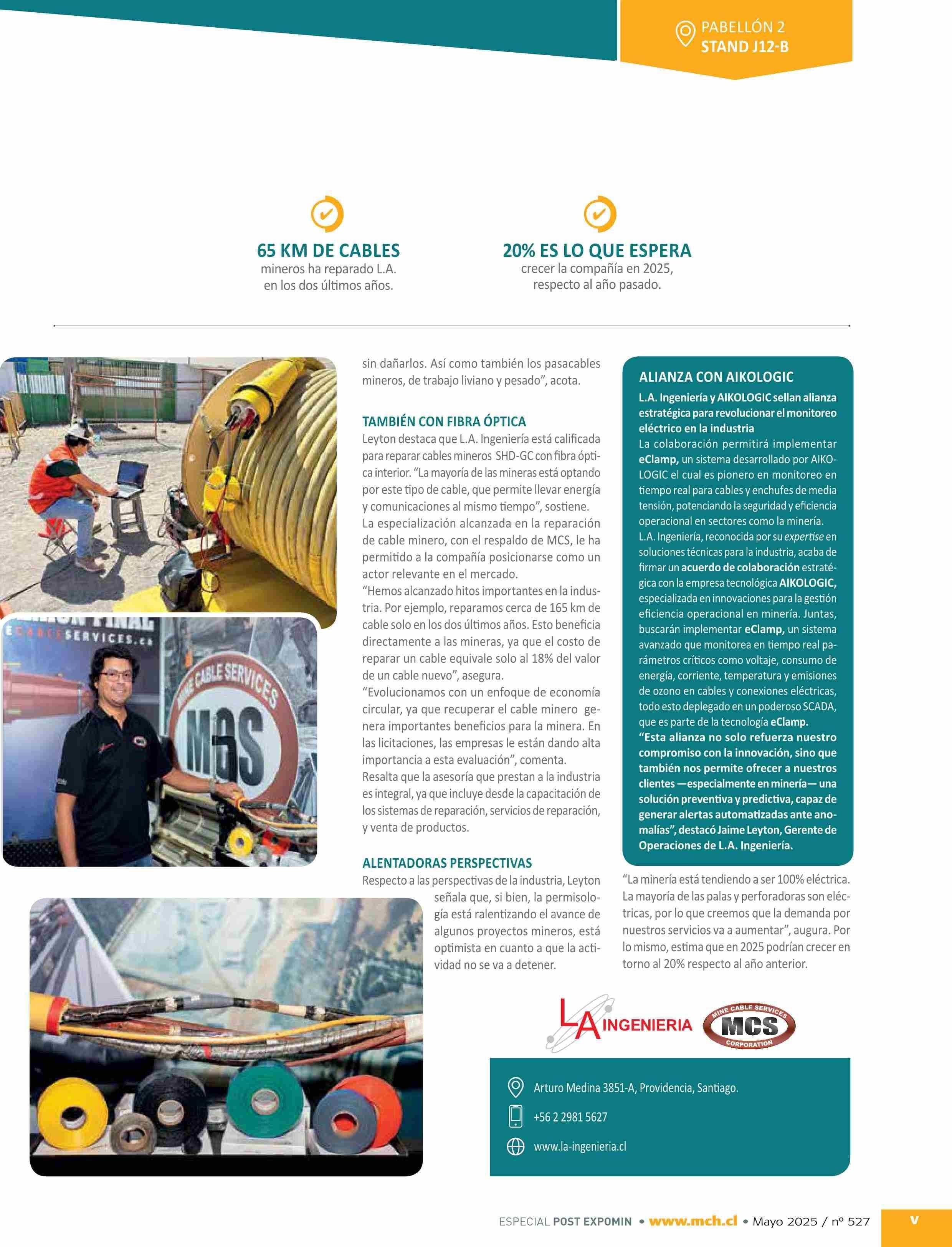L.A. INGENIERÍA EXHIBIÓ EN EXPOMIN INNOVACIONES PARA LA REPARACIÓN DE CABLES MINEROS 27-05-2025 Revista Minería Chilena |