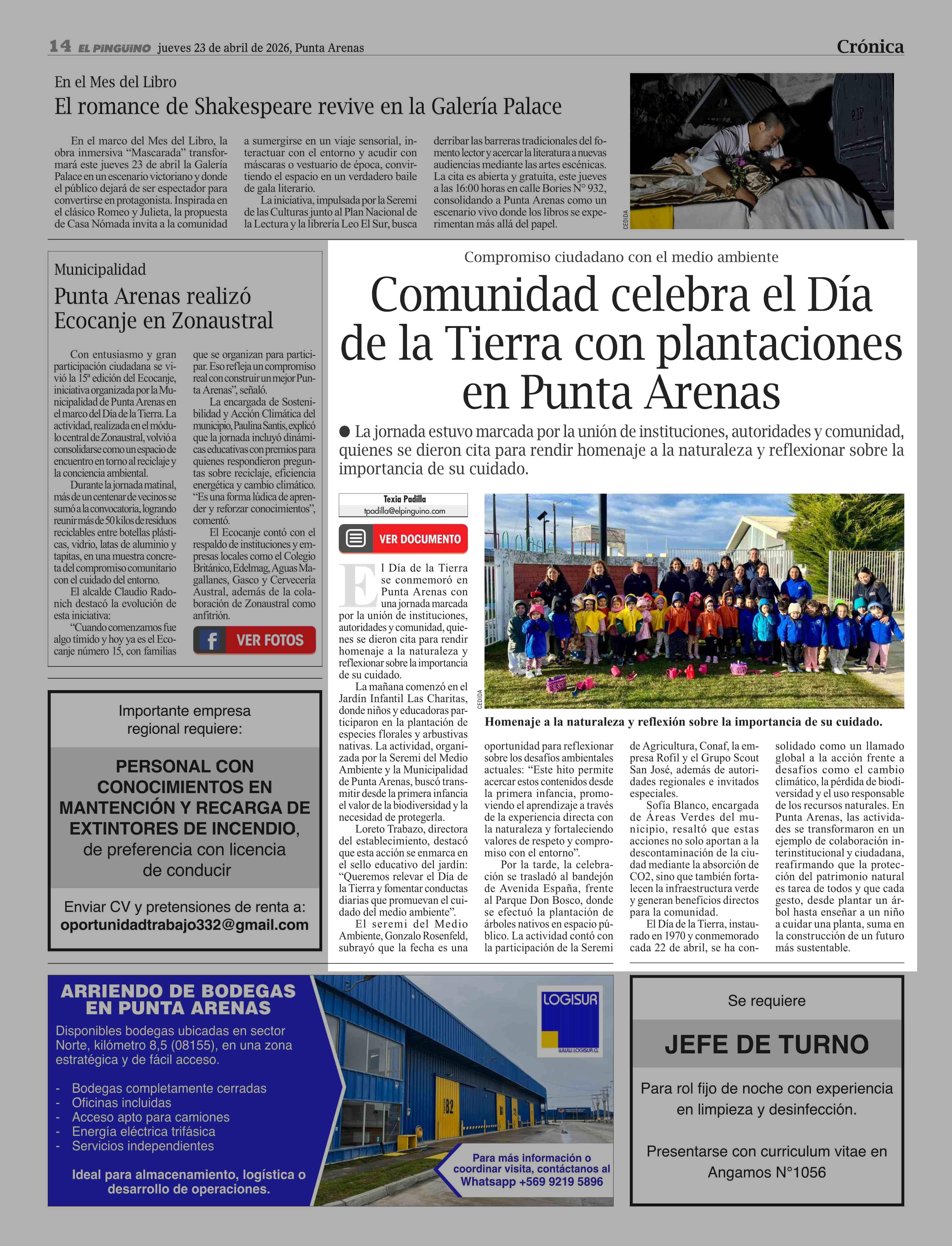 | Título: | Comunidad celebra el Día de la Tierra con plantaciones en Punta Arenas |