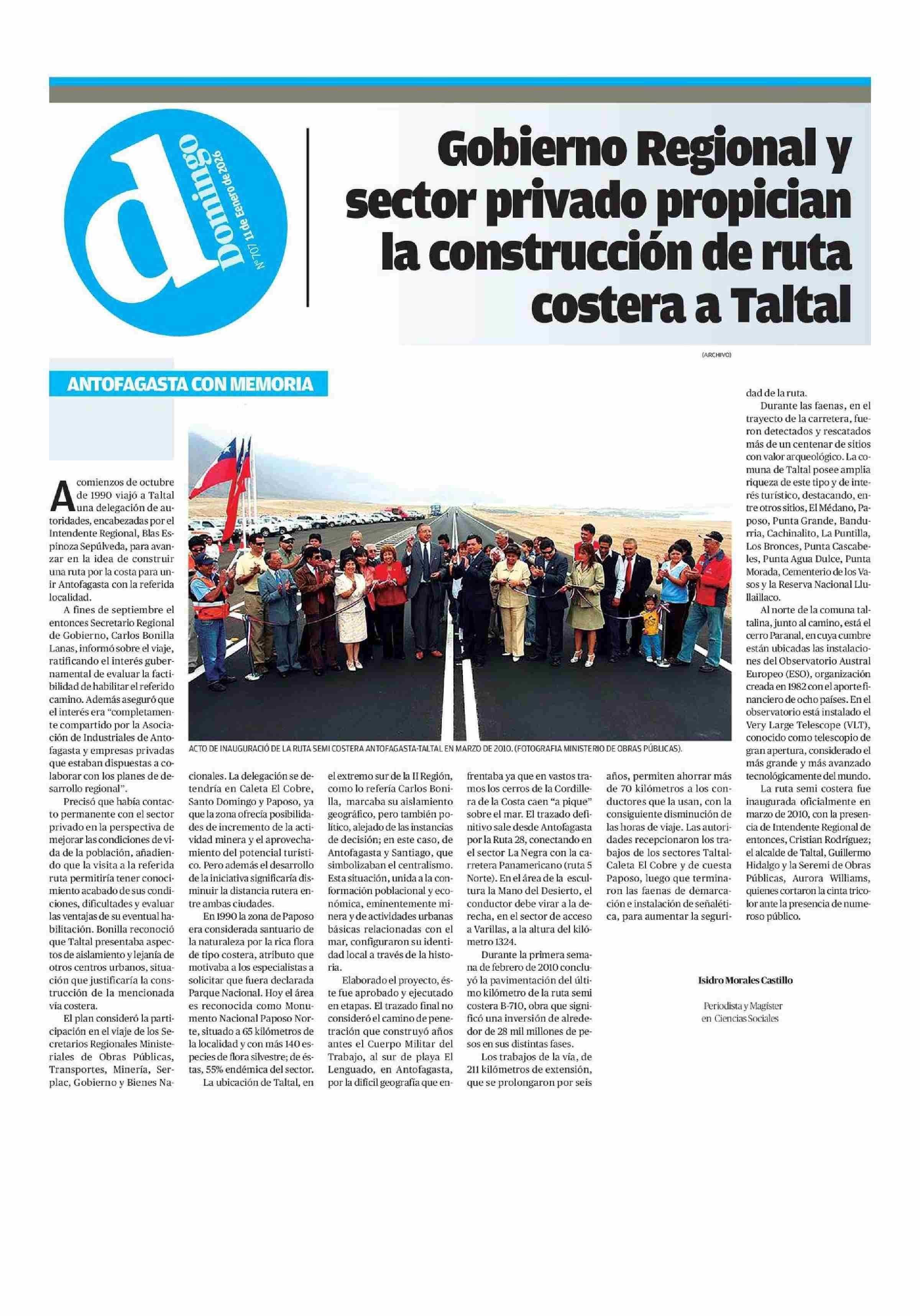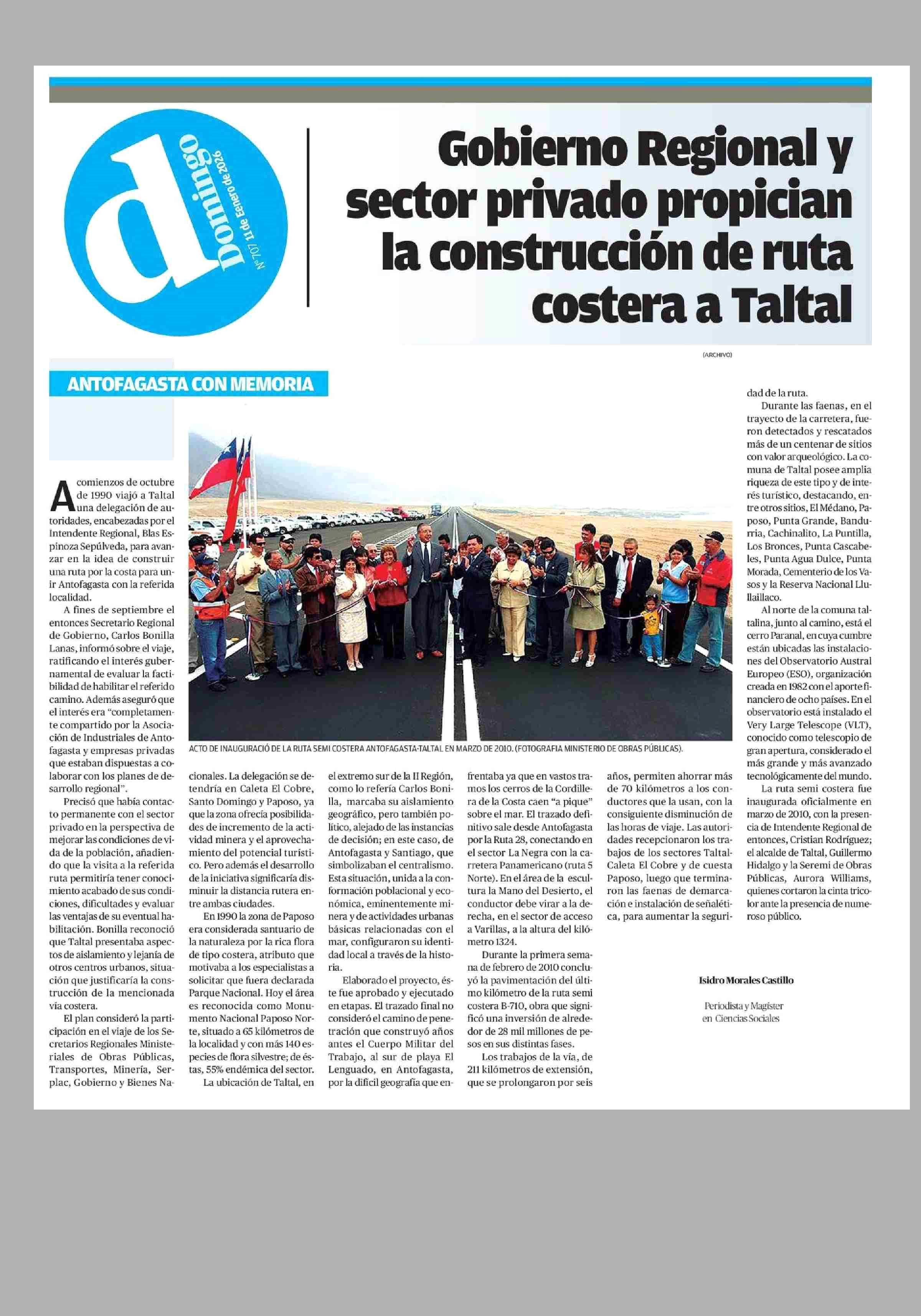 Gobierno Regional y sector privado propician la construcción de ruta costera a Taltal 11-01-2026 El Mercurio de Calama |