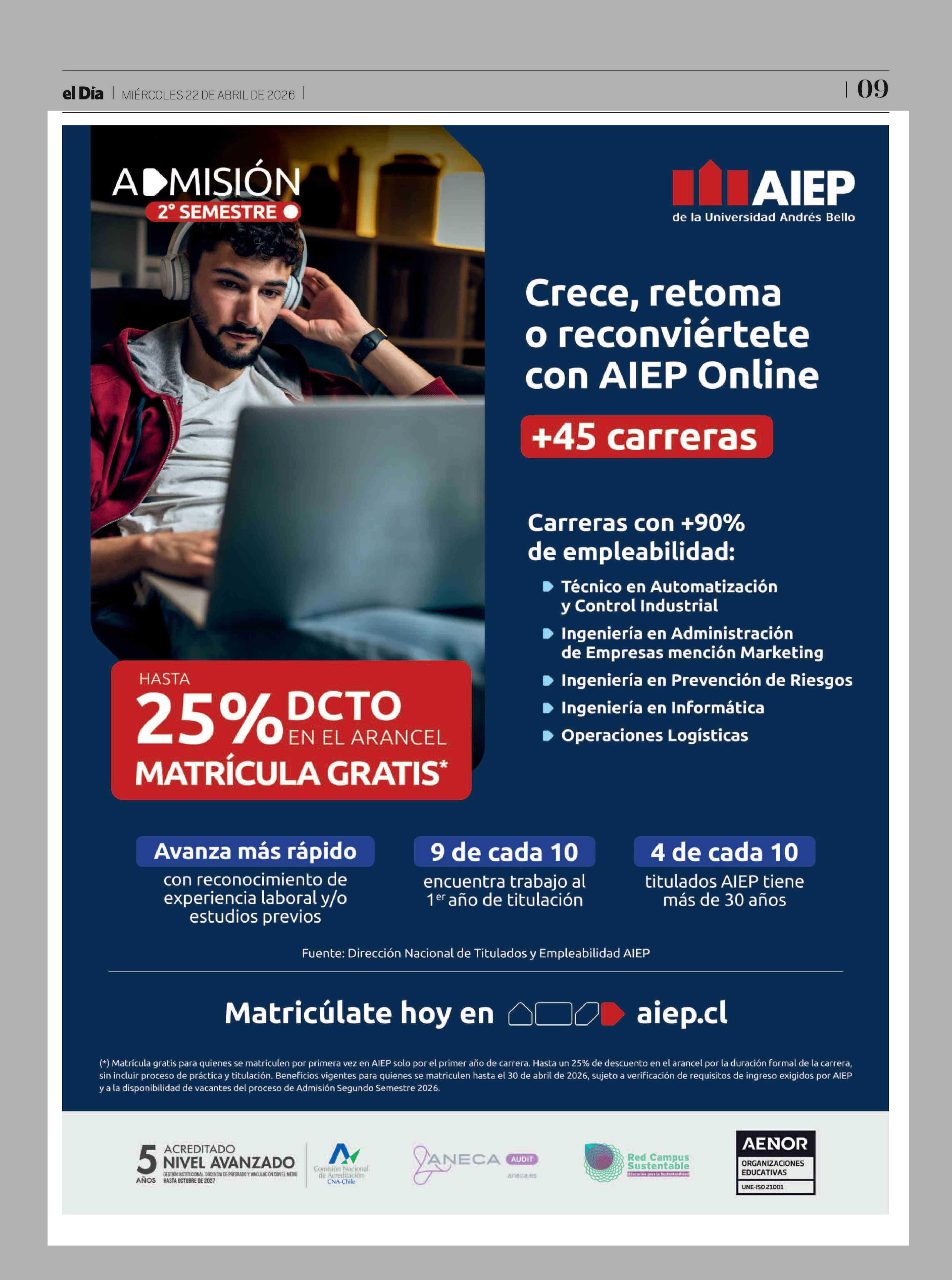 Aviso Educación: AIEP de la Universidad Andrés Bello 22-04-2026 El Día |