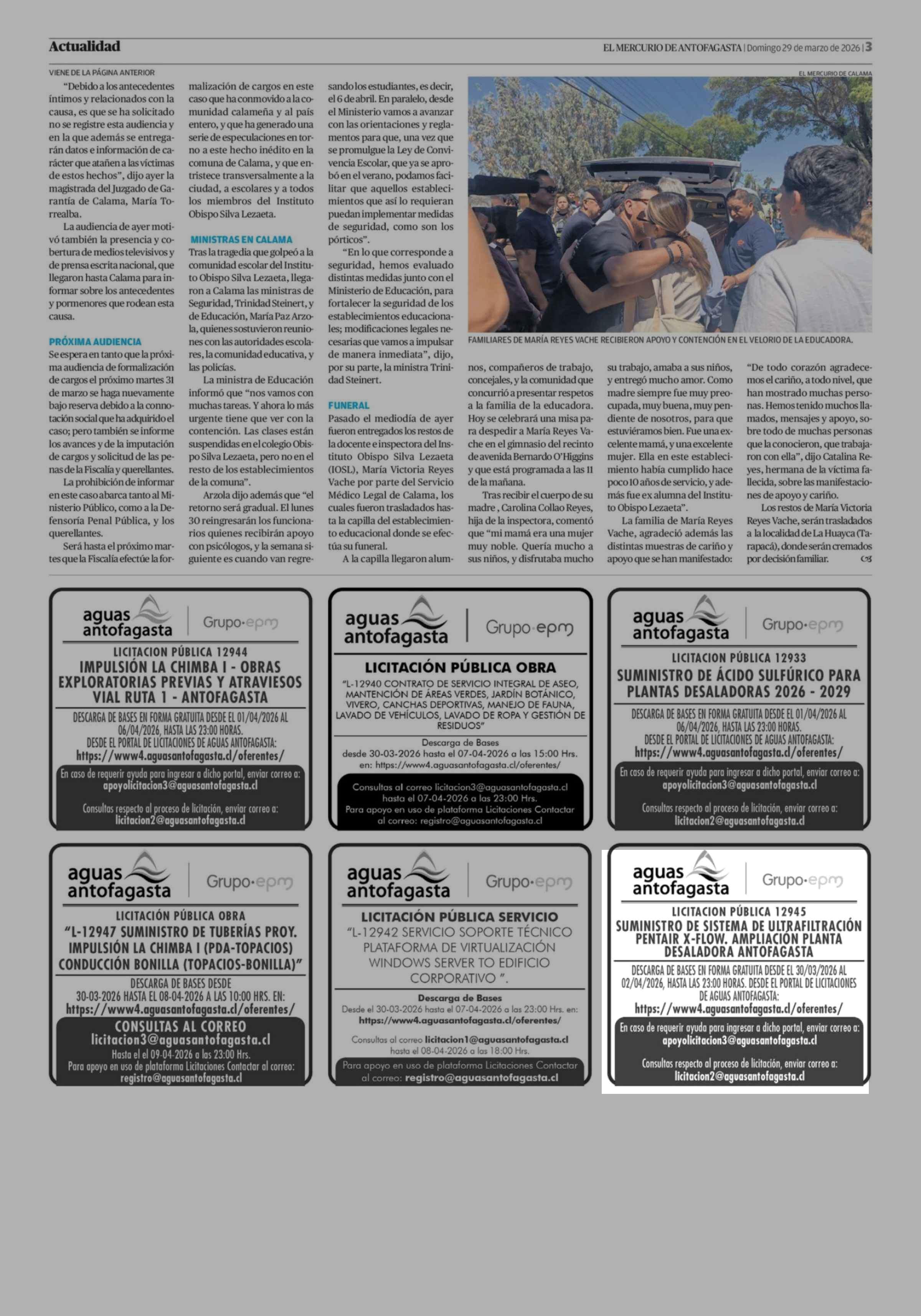 Título: Aviso Licitaciones: aguas antofagasta Grupo.epm LICITACION PÚBLICA 12945 SUMINISTRO DE SISTEMA DE ULTRAFILTRACIÓN PENTAIR X-FLOW. AMPLIACIÓN PLANTA DESALADORA ANTOFAGASTA DESCARGA DE BASES EN FORMA GRATUITA DESDE EL 30/03/2026 AL 02/04/2026, HASTA LAS 23:00 HORAS. DESDE EL PORTAL DE LICITACIONES DE