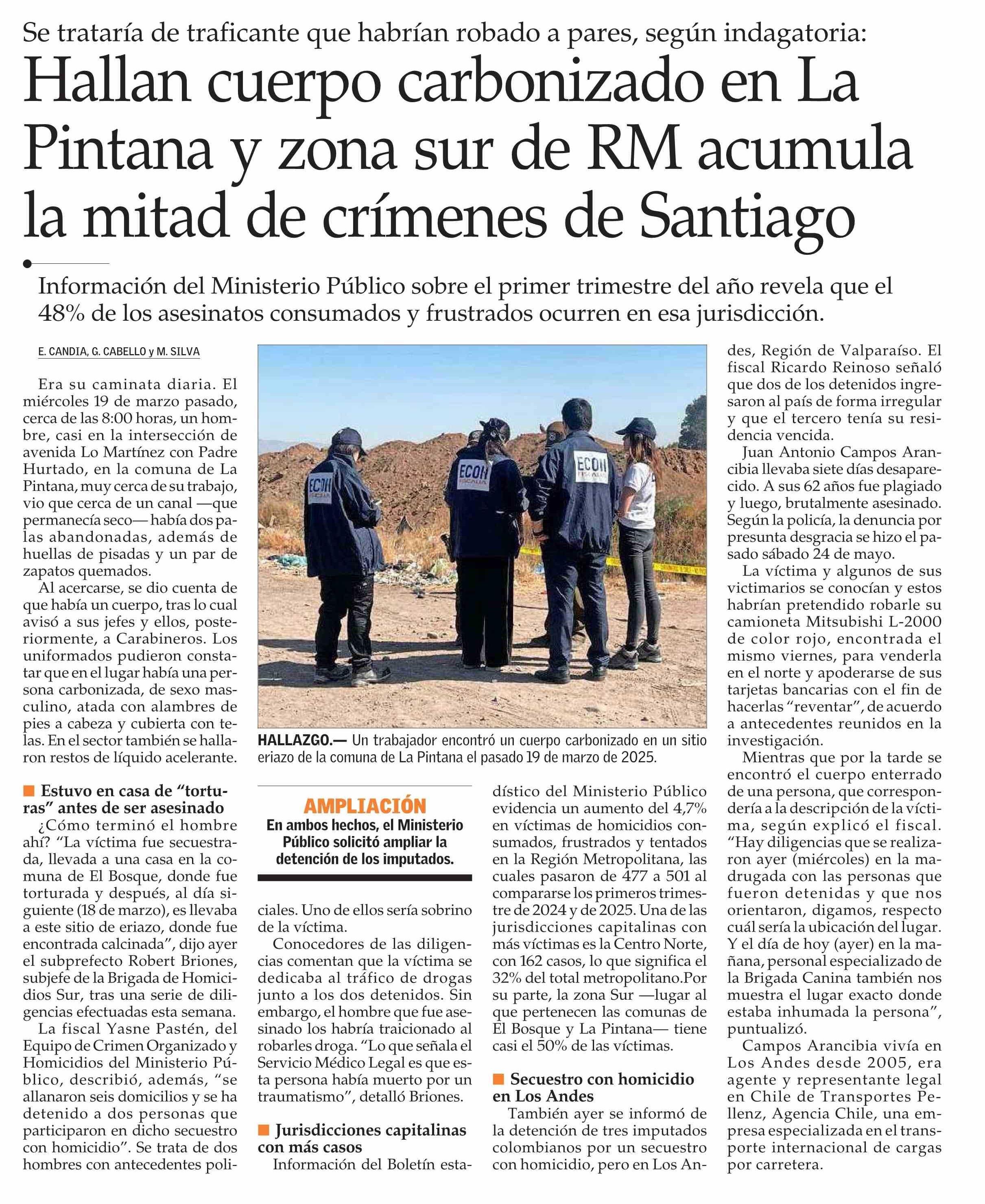 Hallan cuerpo carbonizado en La Pintana y zona sur de RM acumula la mitad de crímenes de Santiago 30-05-2025 El Mercurio |