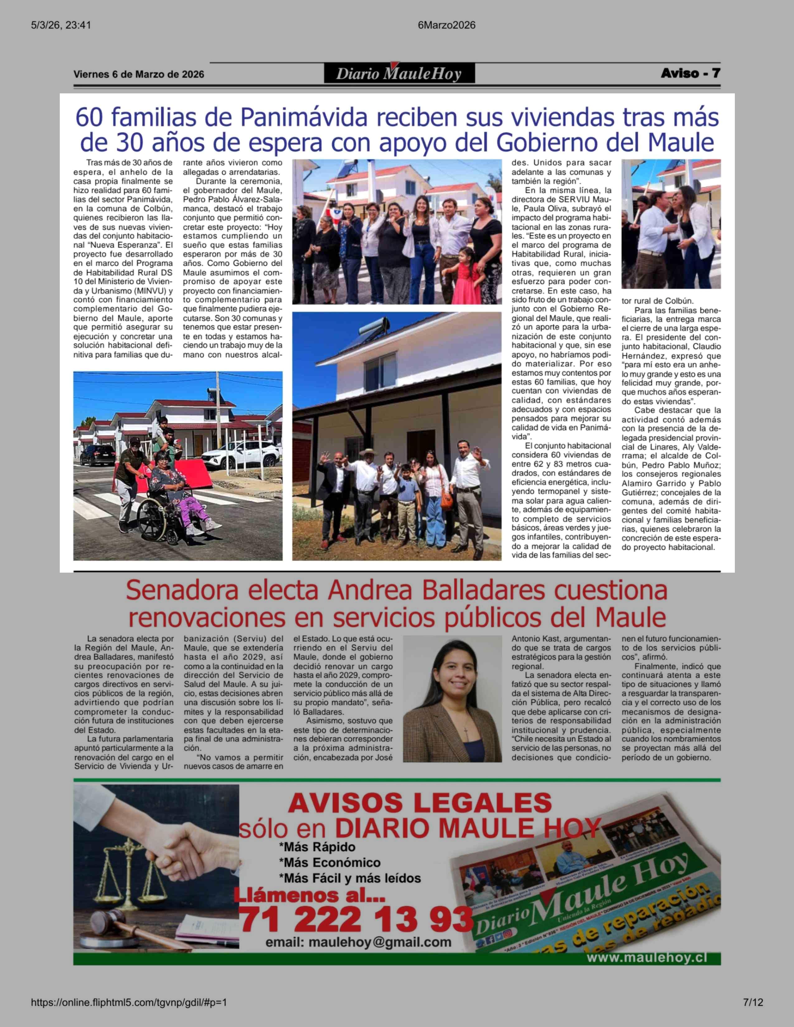 60 Familias de Panimávida reciben sus viviendas tras más de 30 años de espera con apoyo del Gobierno del Maule 06-03-2026 Maule Hoy |