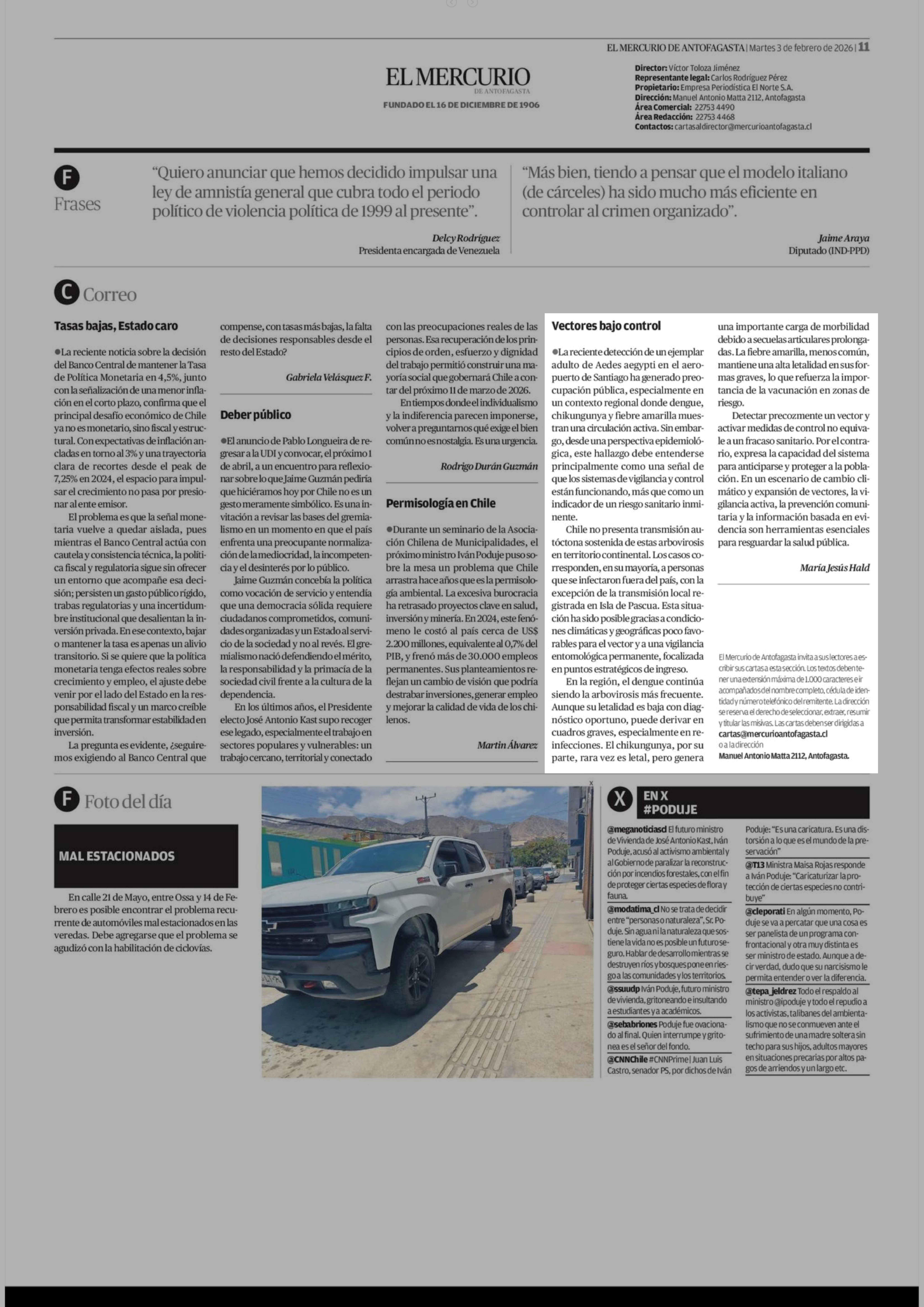 Cartas: Vectores bajo control 03-02-2026 El Mercurio de Antofagasta |