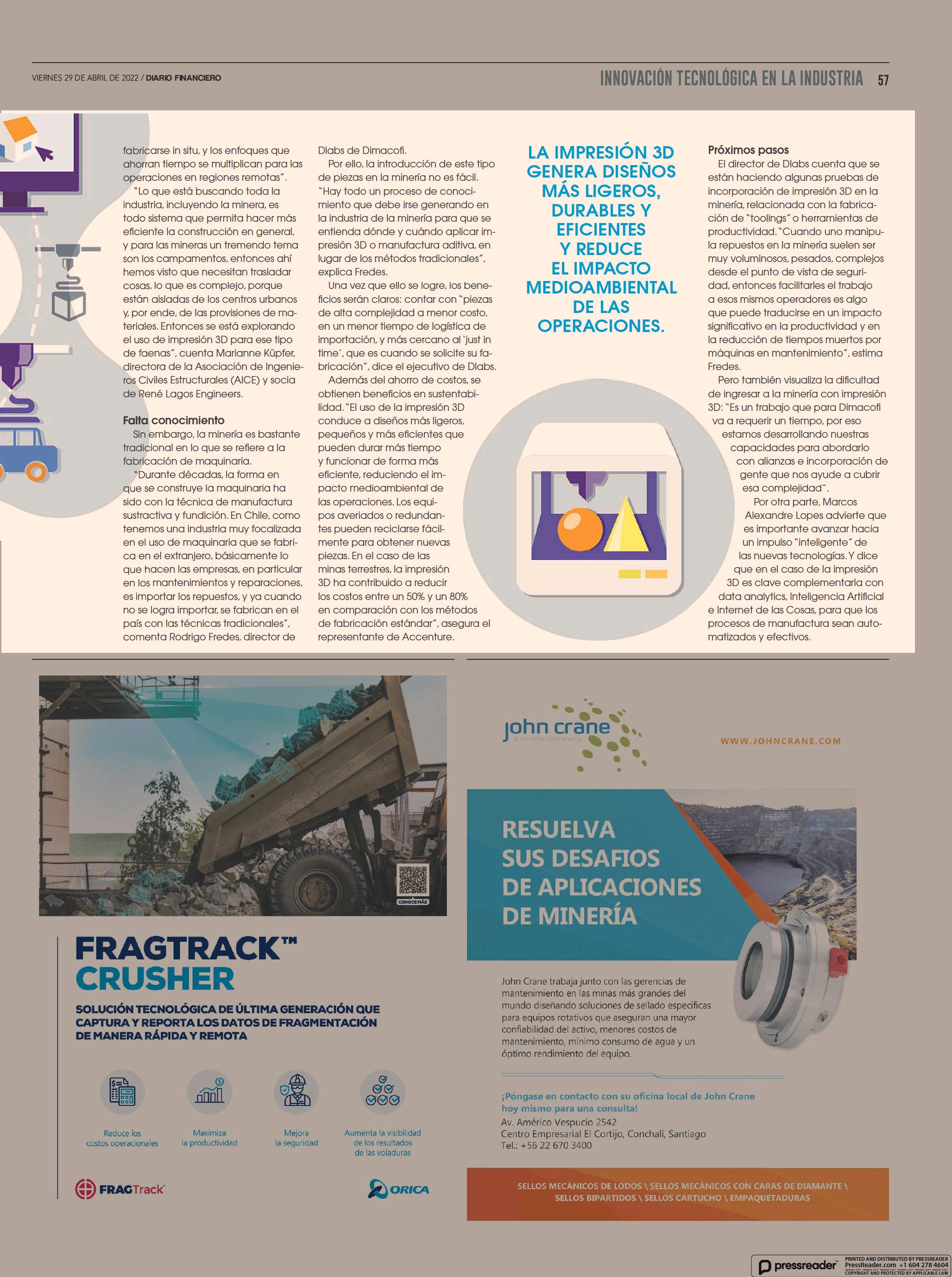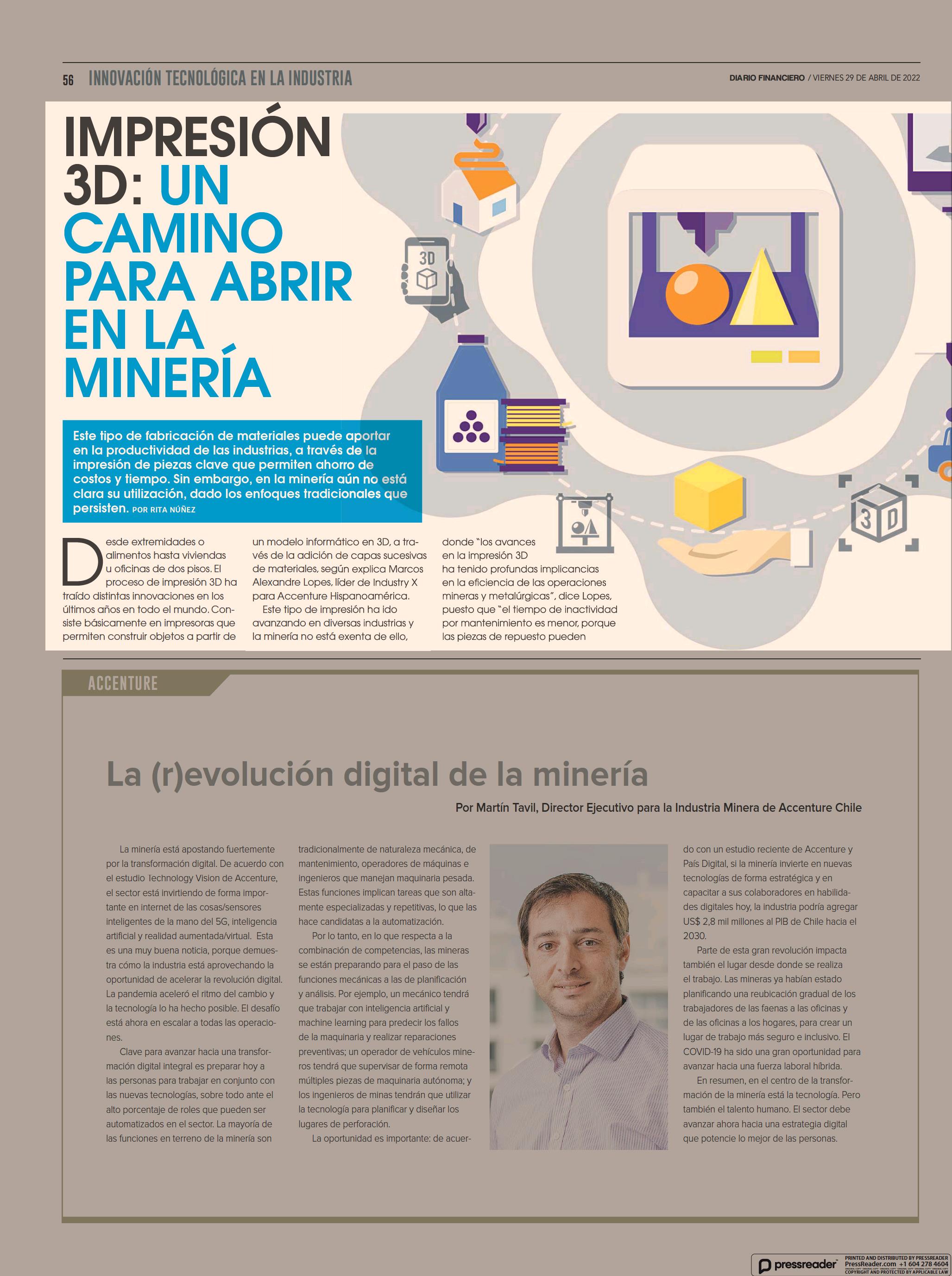 IMPRESIÓN 3D: UN CAMINO PARA ABRIR EN LA MINERÍA 29-04-2022 Diario Financiero |