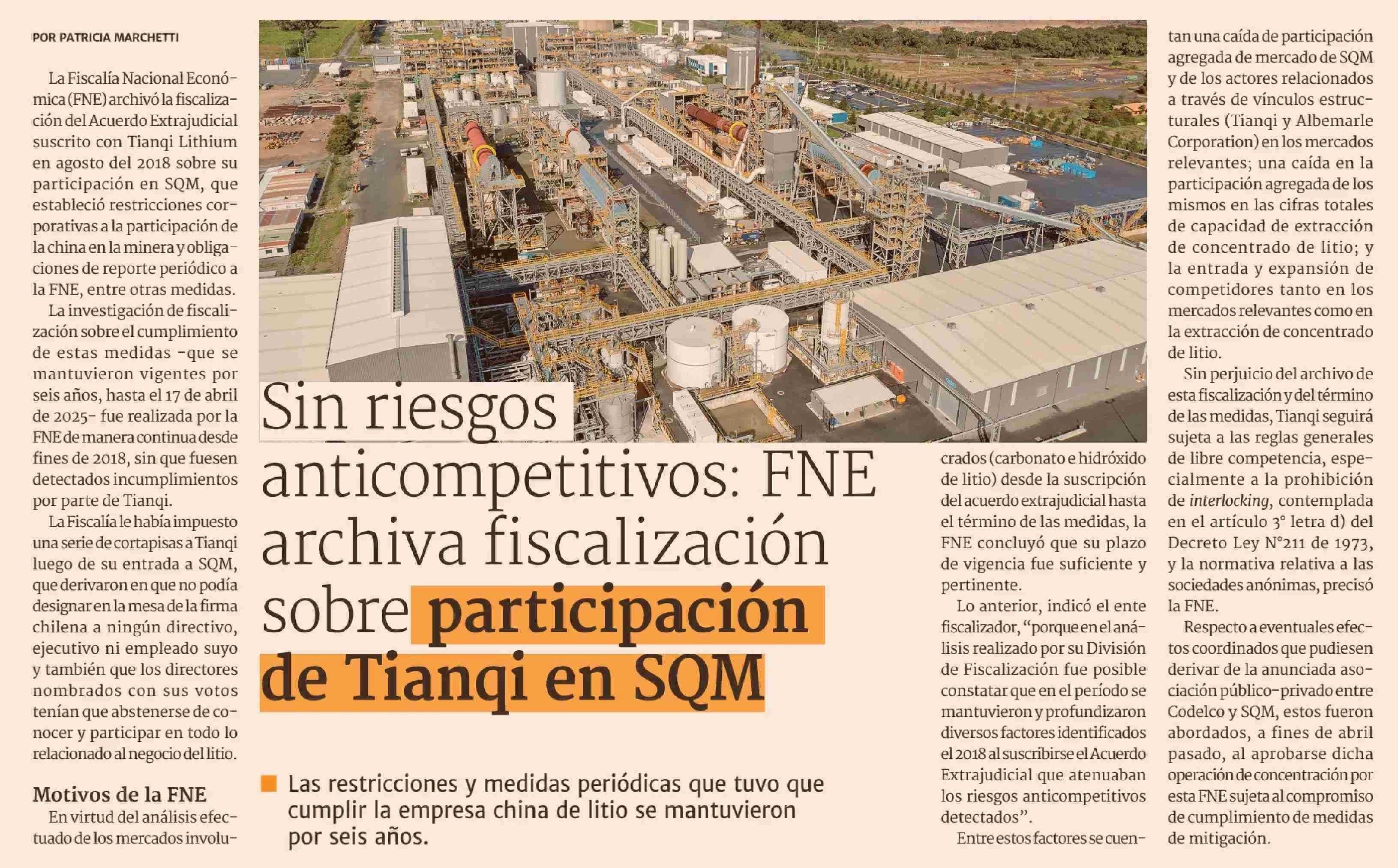 Sin riesgos anticompetitivos: FNE archiva fiscalización sobre participación de Tianqi en SQM 11-06-2025 Diario Financiero |