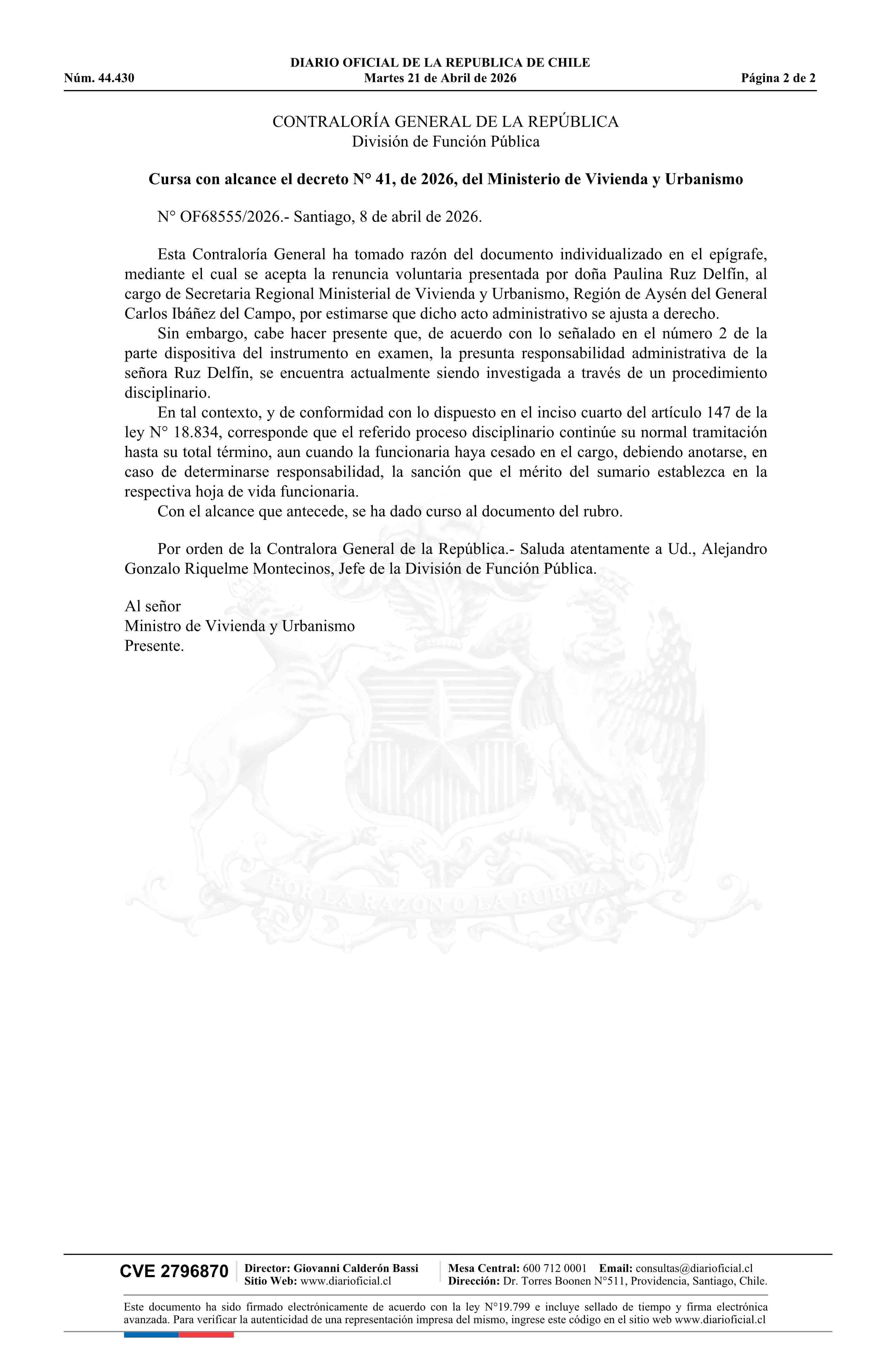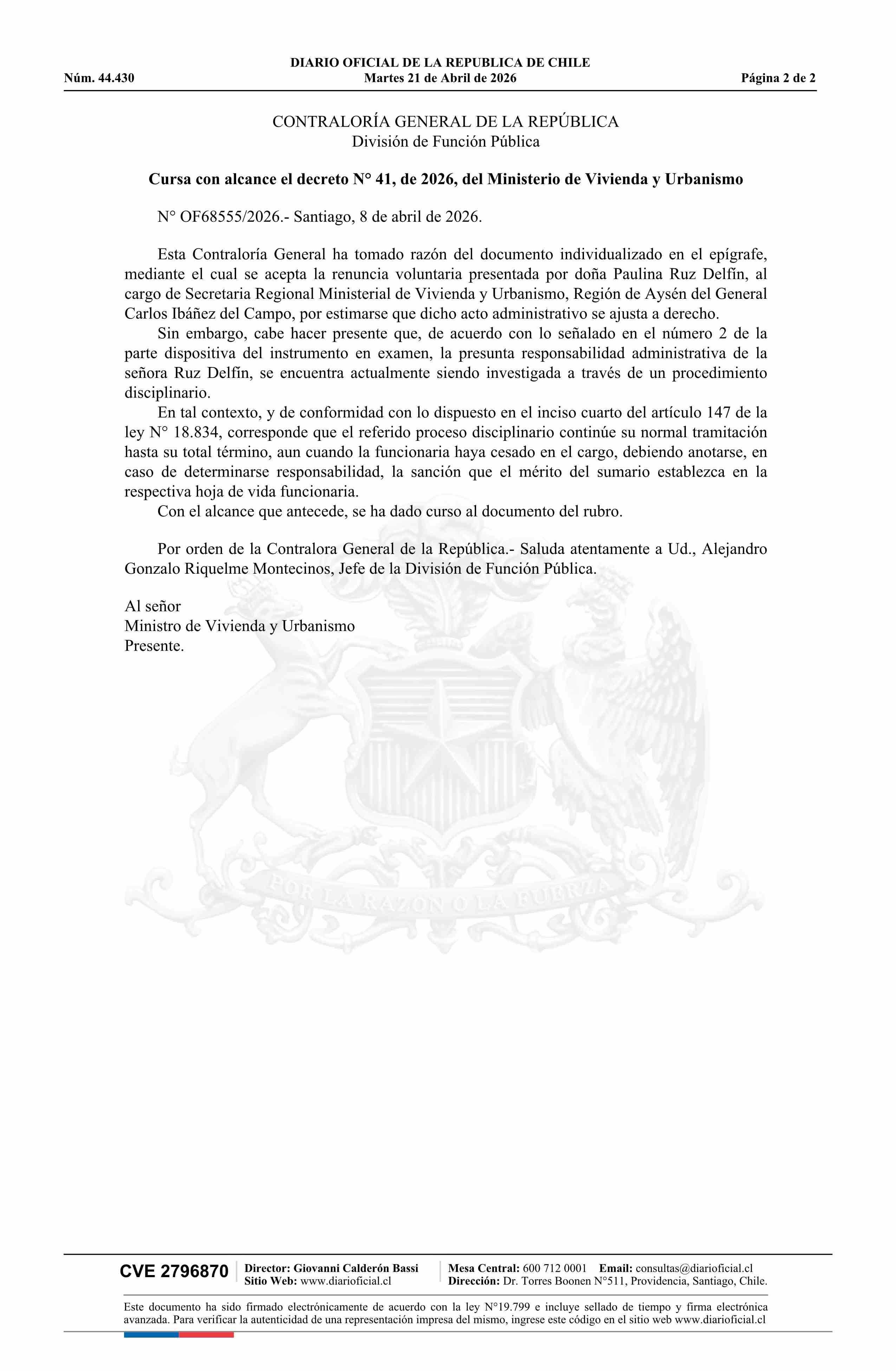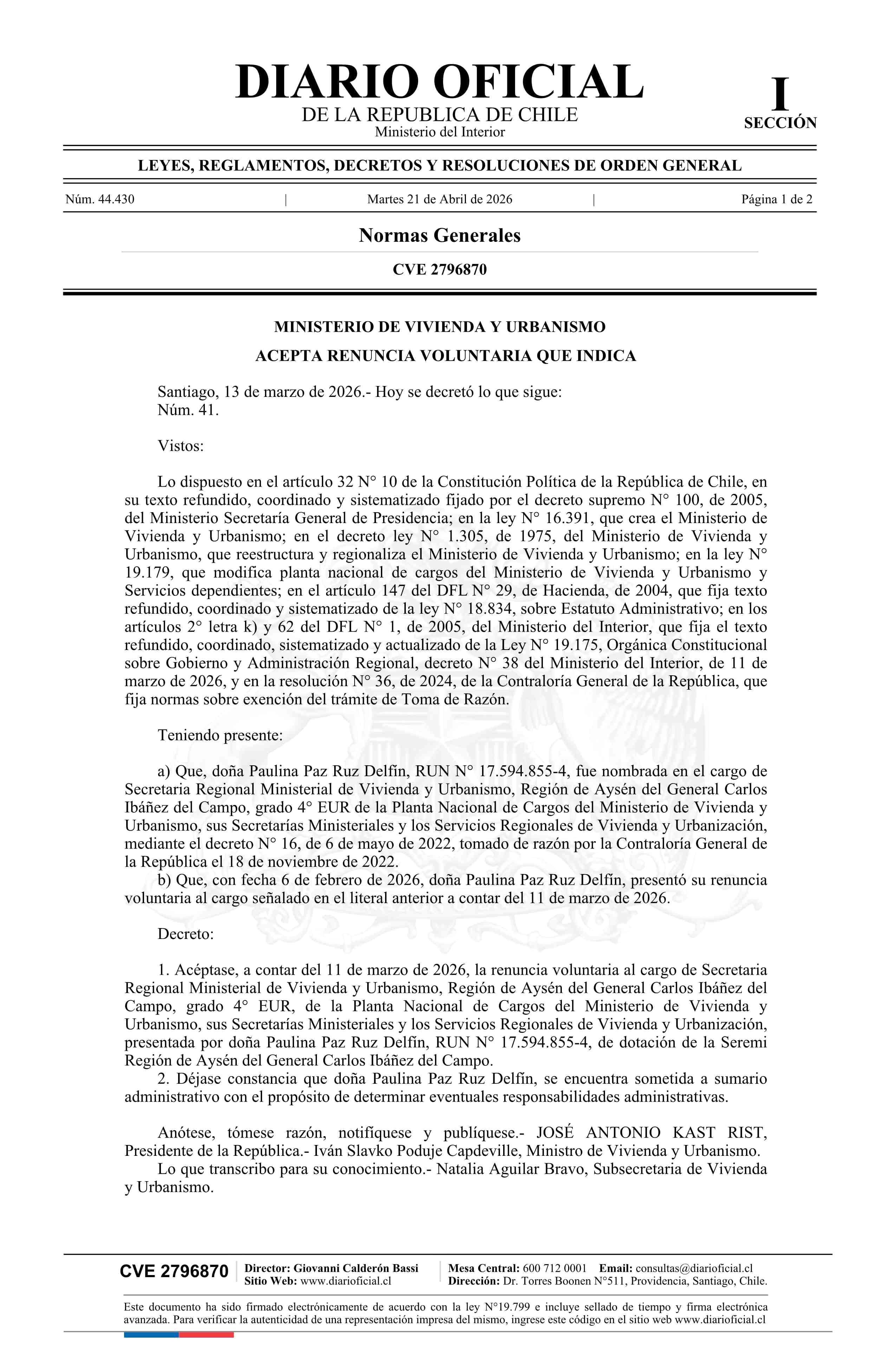 | Título: | Decreto número 41, de 2026.- Acepta renuncia voluntaria de doña Paulina Paz Ruz Delfín al cargo de Secretaria Regional Ministerial de Vivienda y Urbanismo, Región de Aysén del General Carlos Ibáñez del Campo |