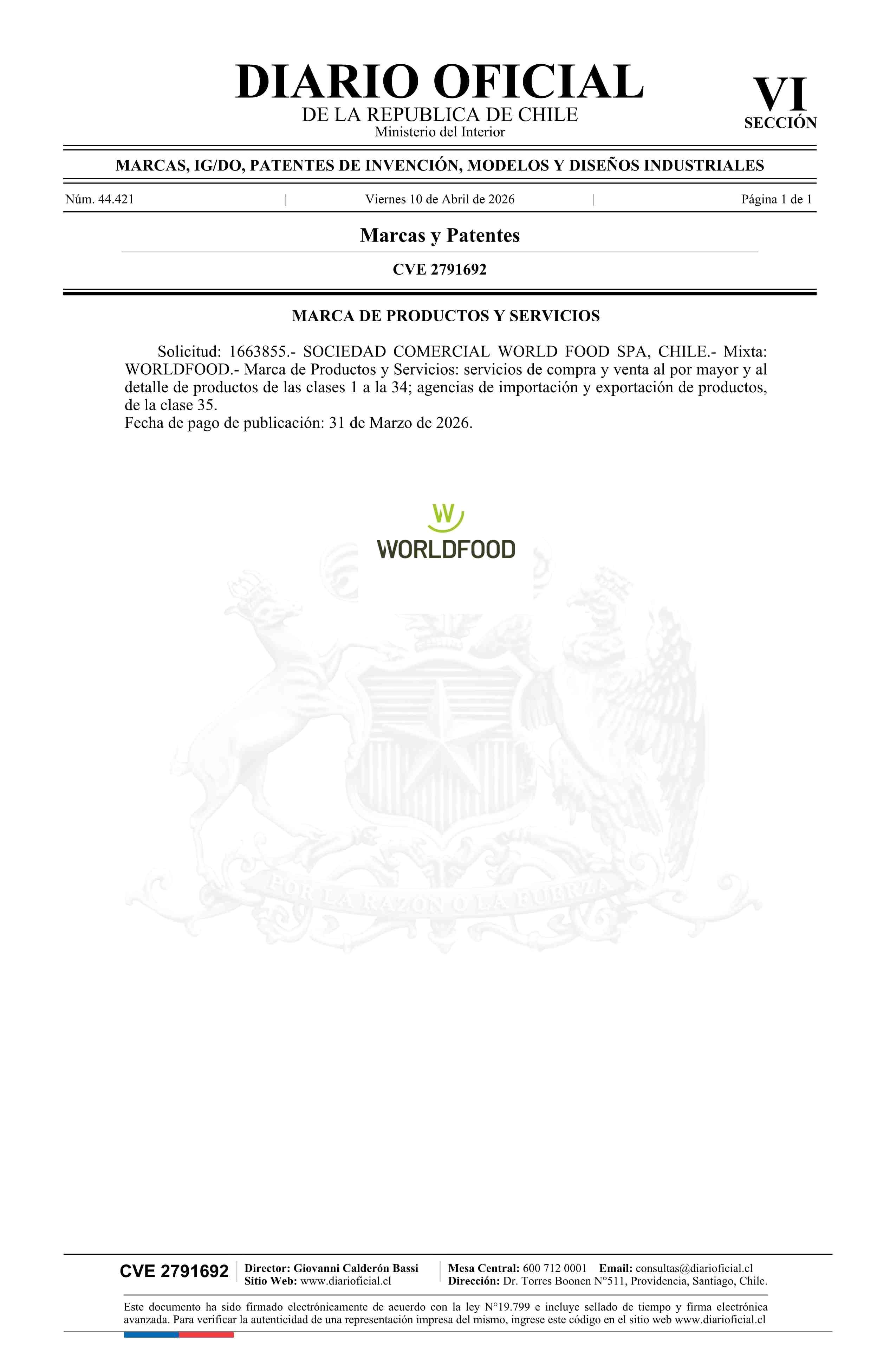 Solicitud número 1663855.- WORLDFOOD 10-04-2026 Diario Oficial Edición Electrónica |