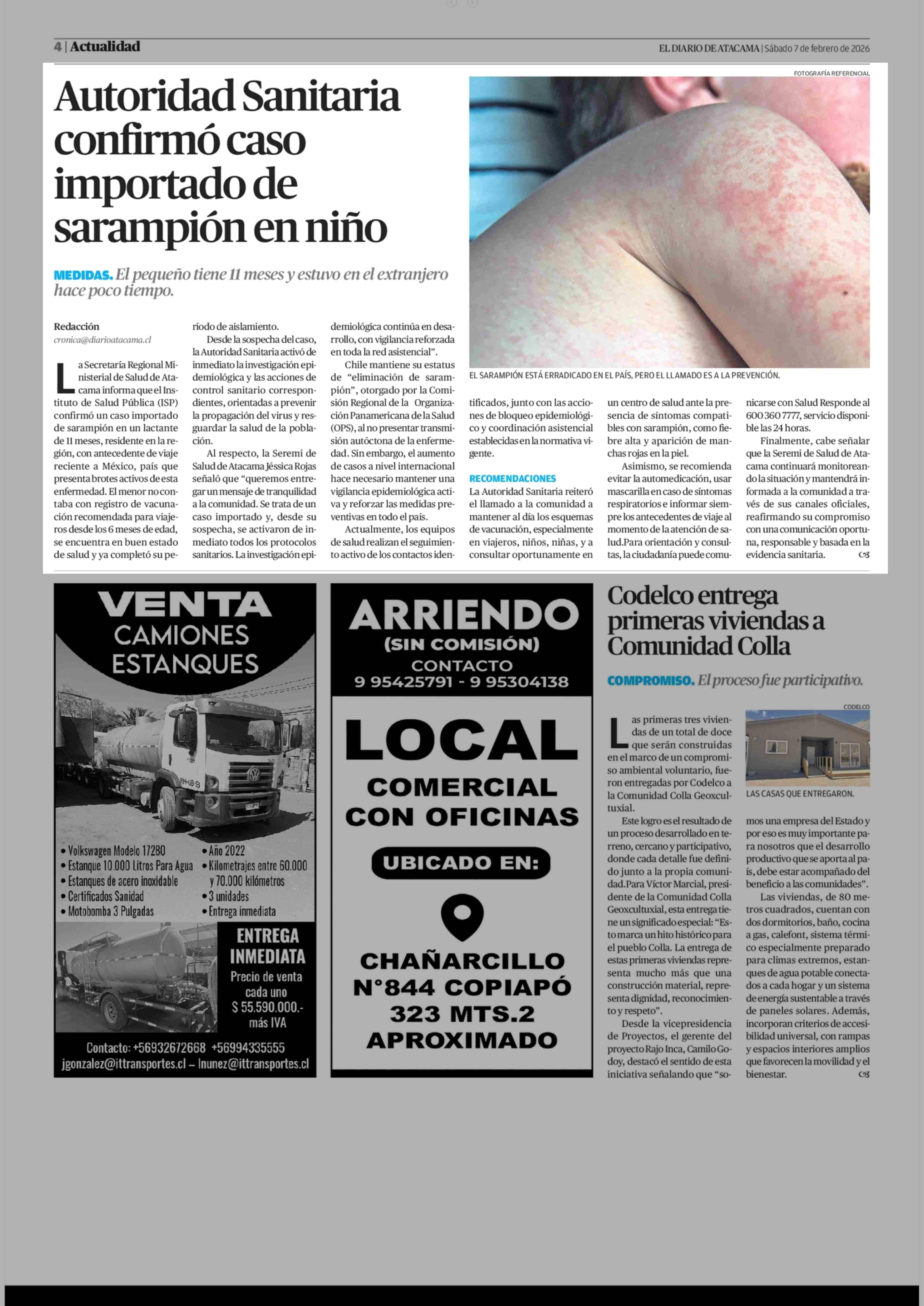 Autoridad Sanitaria confirmó caso importado de sarampión en niño 07-02-2026 El Diario de Atacama |
