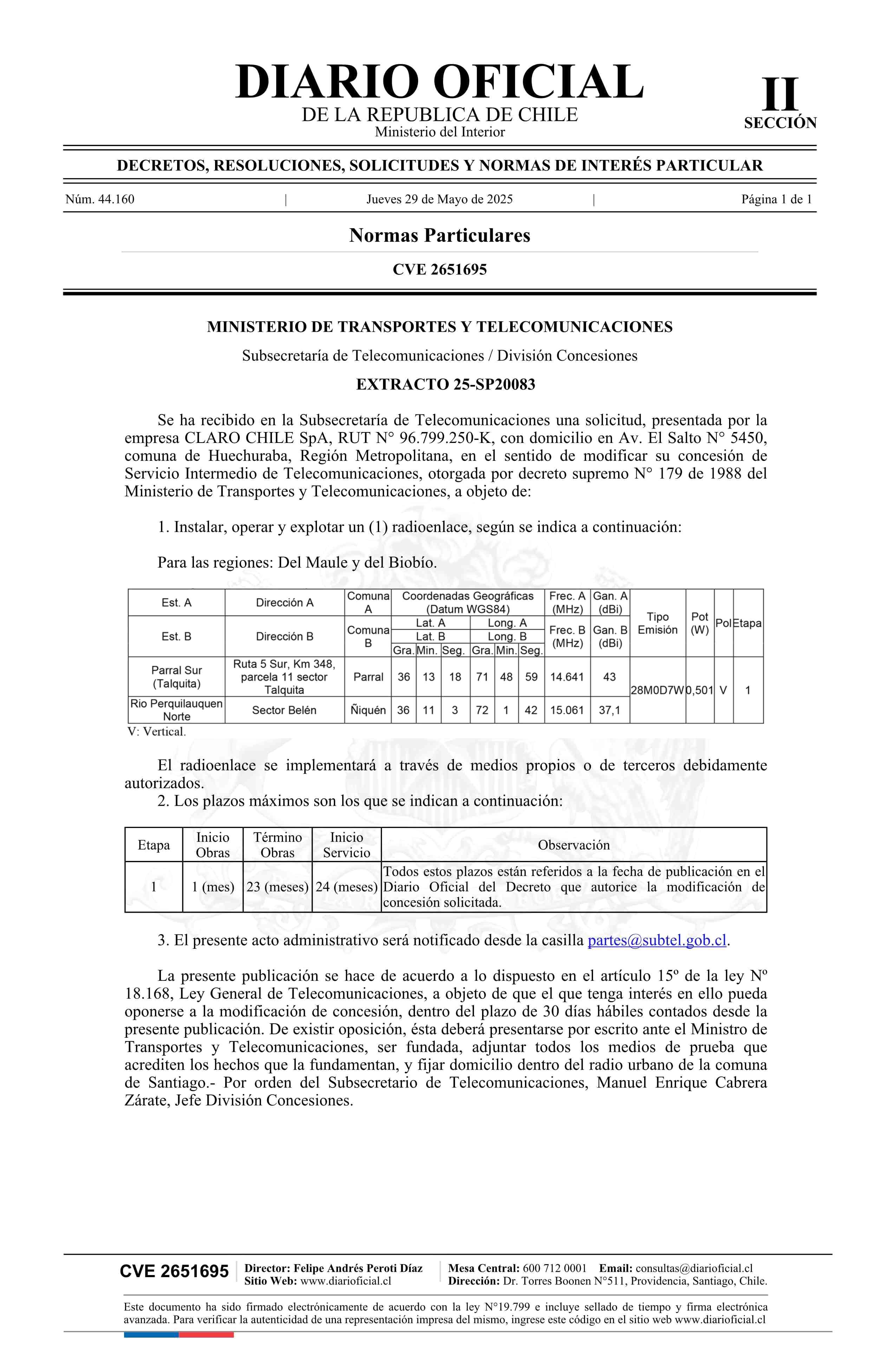 Solicitud número 25-SP20083.- Claro Chile SpA 29-05-2025 Diario Oficial Edición Electrónica |