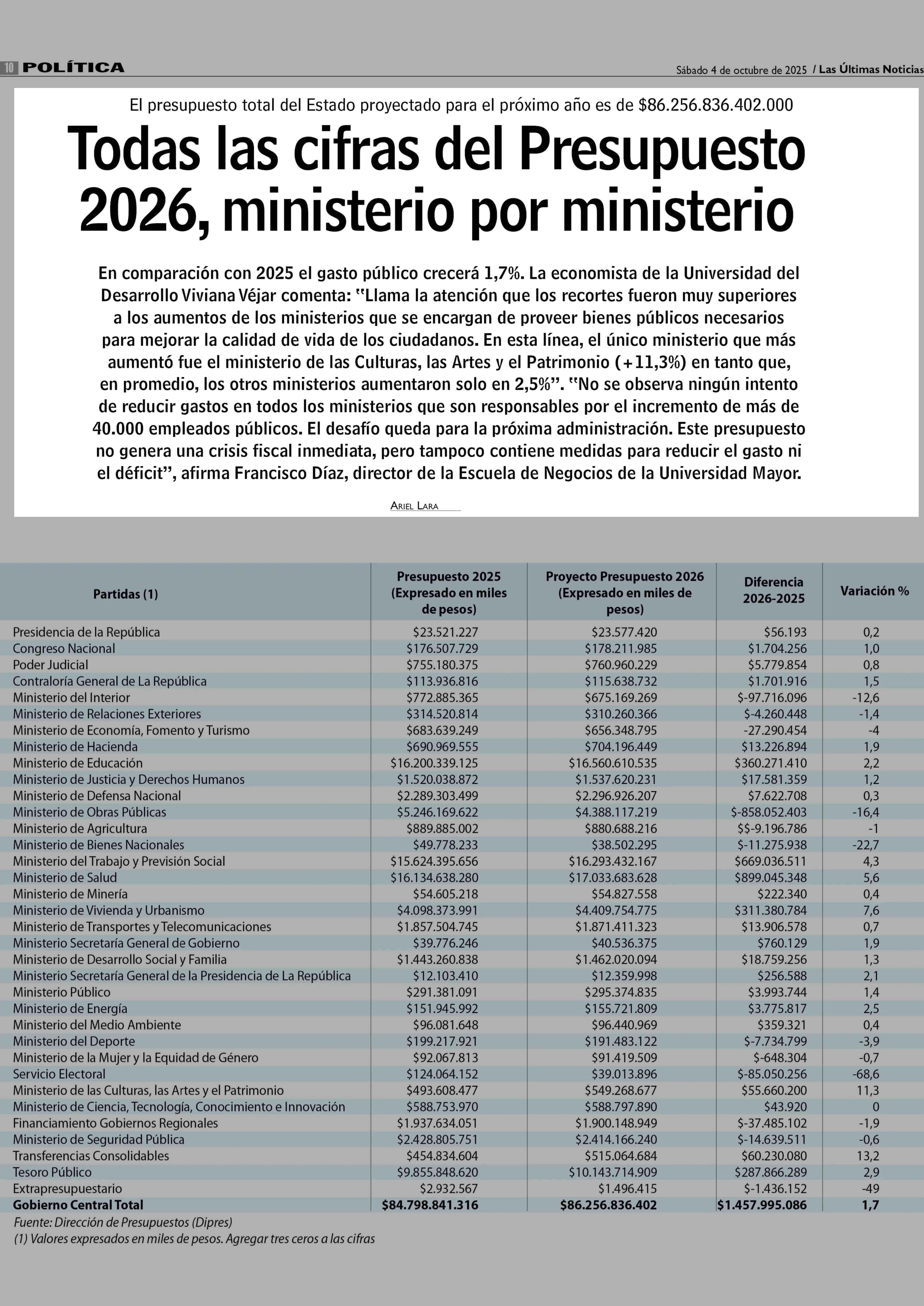 Todas las cifras del Presupuesto 2026, ministerio por ministerio 04-10-2025 Las Últimas Noticias |
