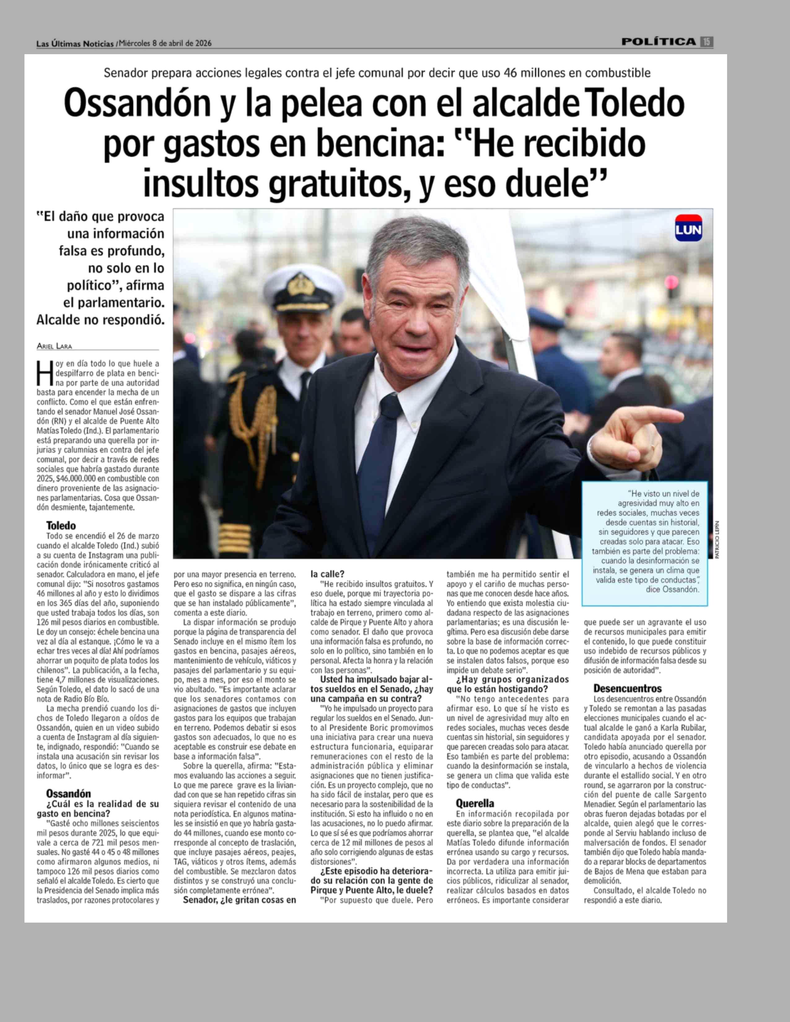 Ossandón y la pelea con el alcalde Toledo por gastos en bencina: "He recibido insultos gratuitos, y eso duele" 08-04-2026 Las Últimas Noticias |