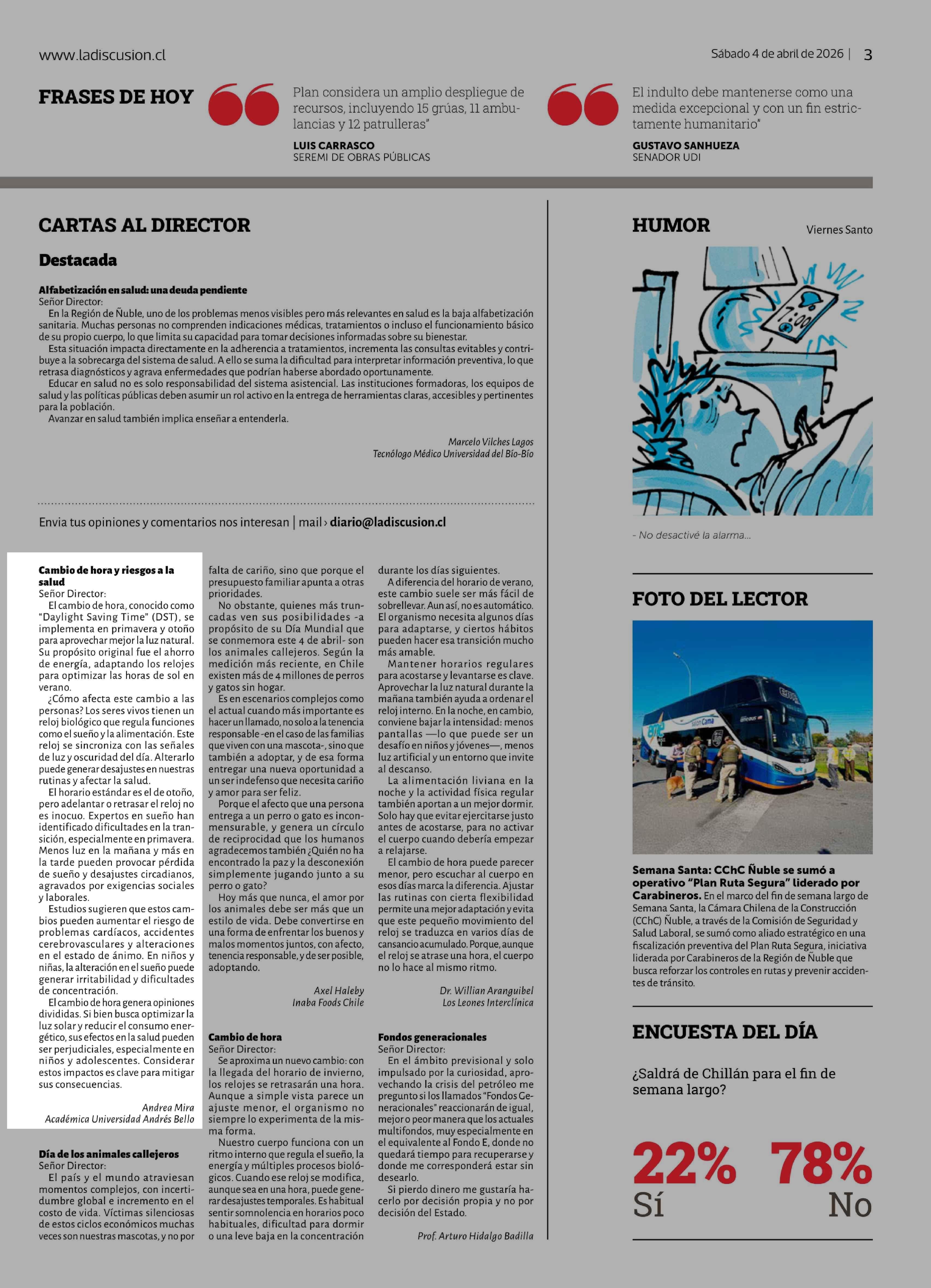 CARTAS: Cambio de hora y riesgos a la salud 04-04-2026 La Discusión |