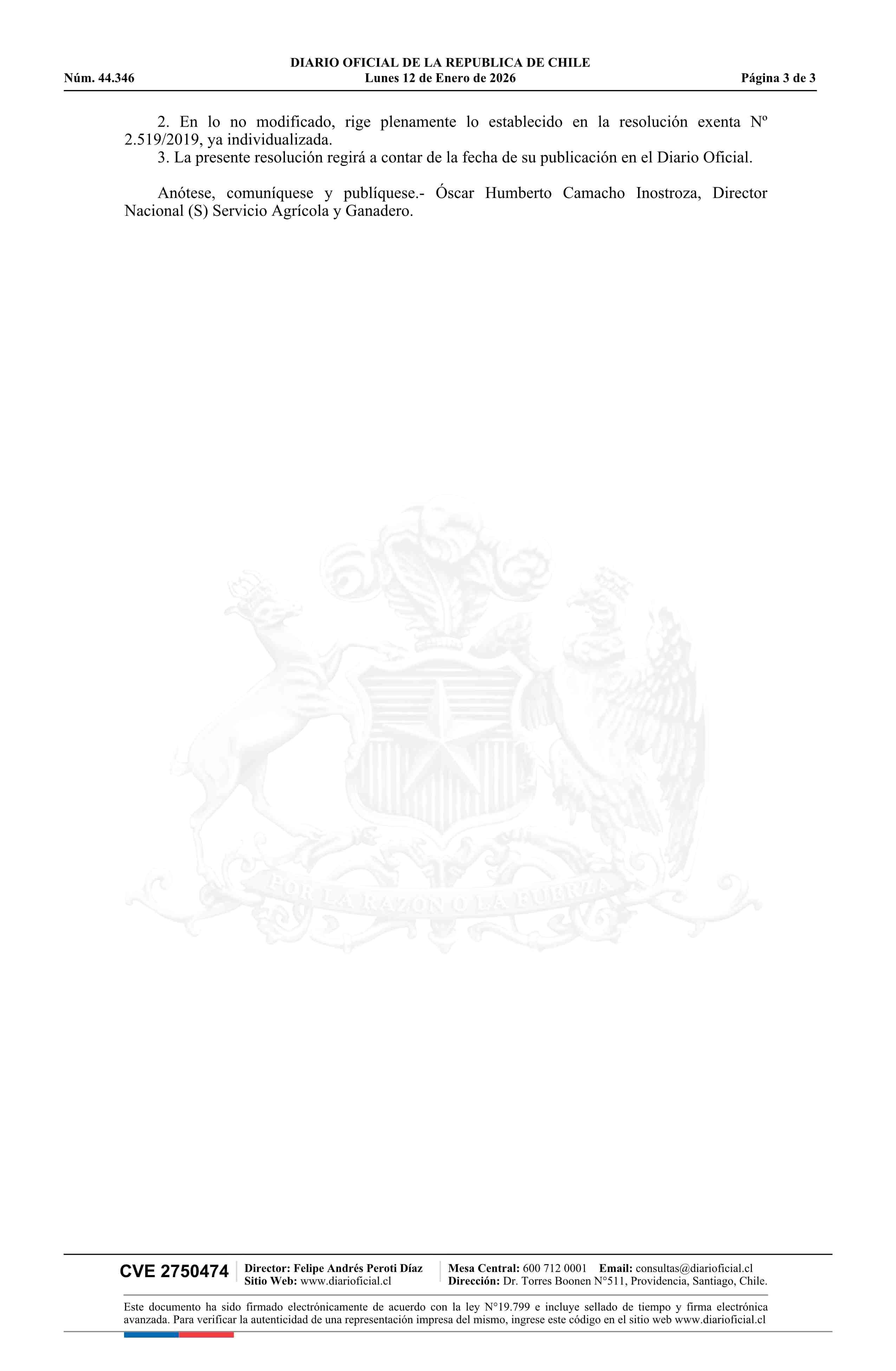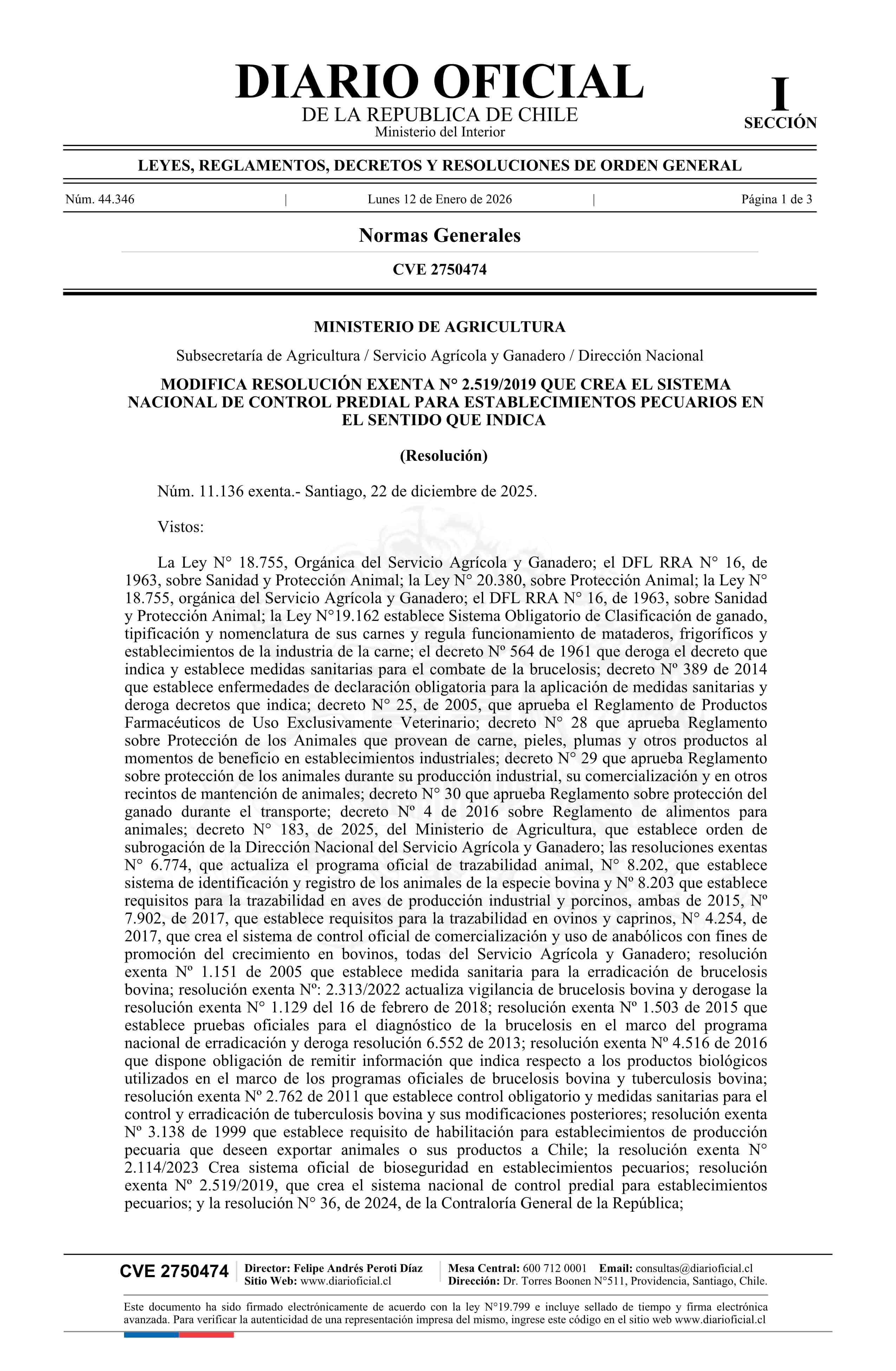 Resolución exenta número 11.136, de 2025.- Modifica resolución exenta N° 2.519/2019 que crea el Sistema Nacional de Control Predial para Establecimientos Pecuarios 12-01-2026 Diario Oficial Edición Electrónica |