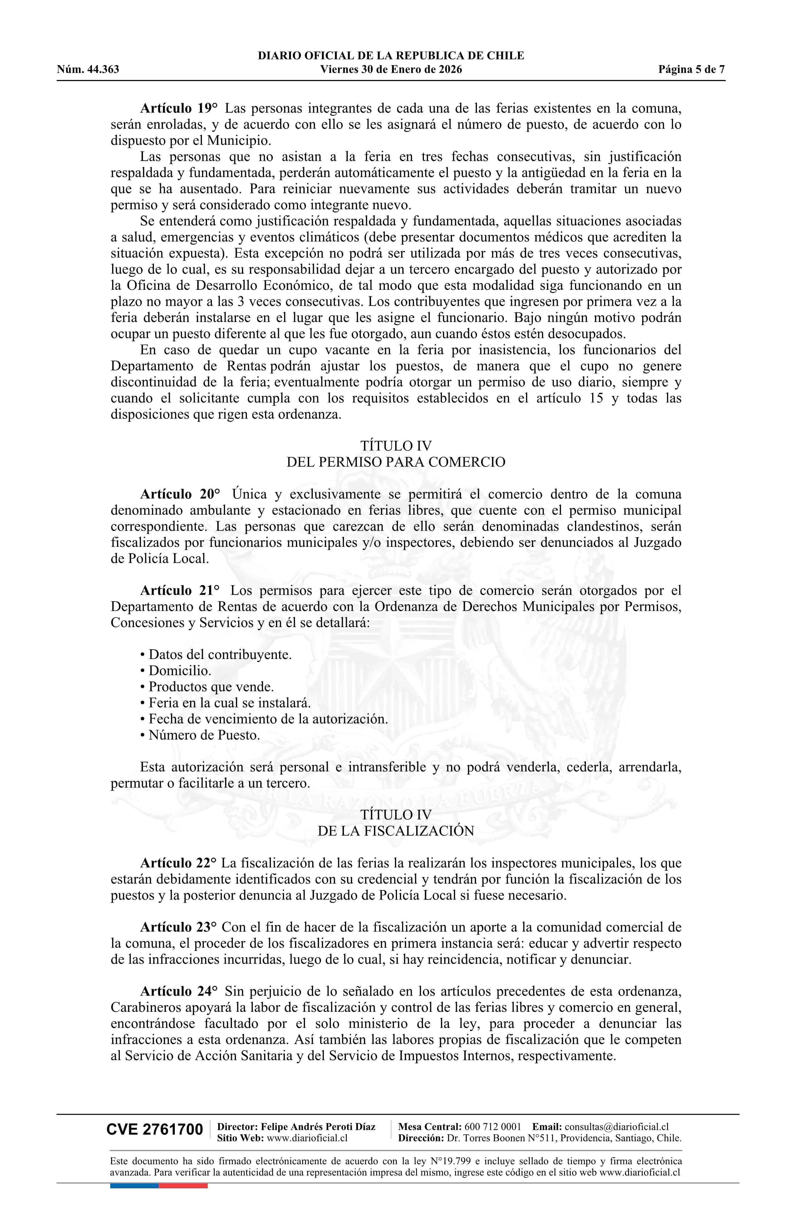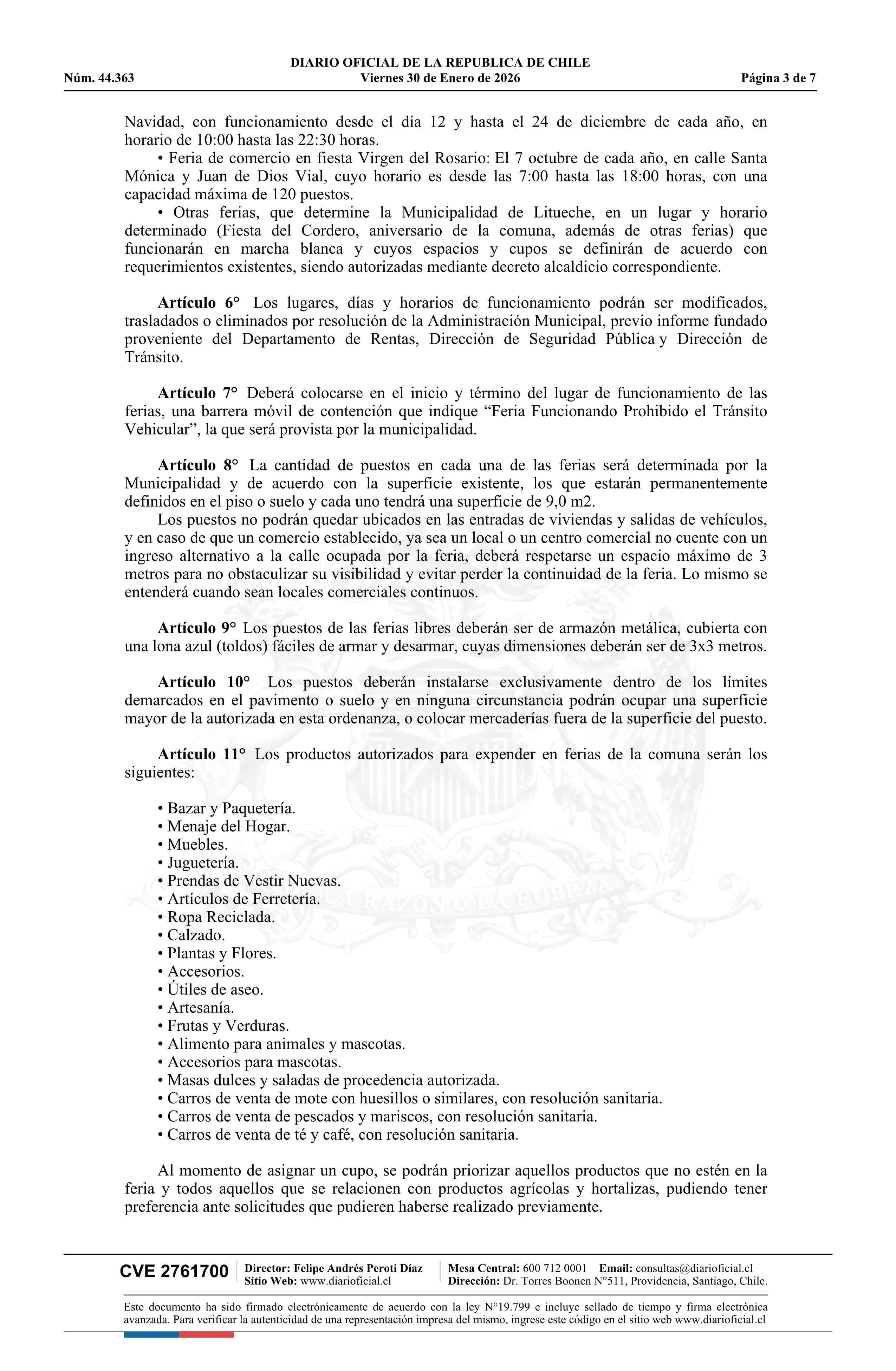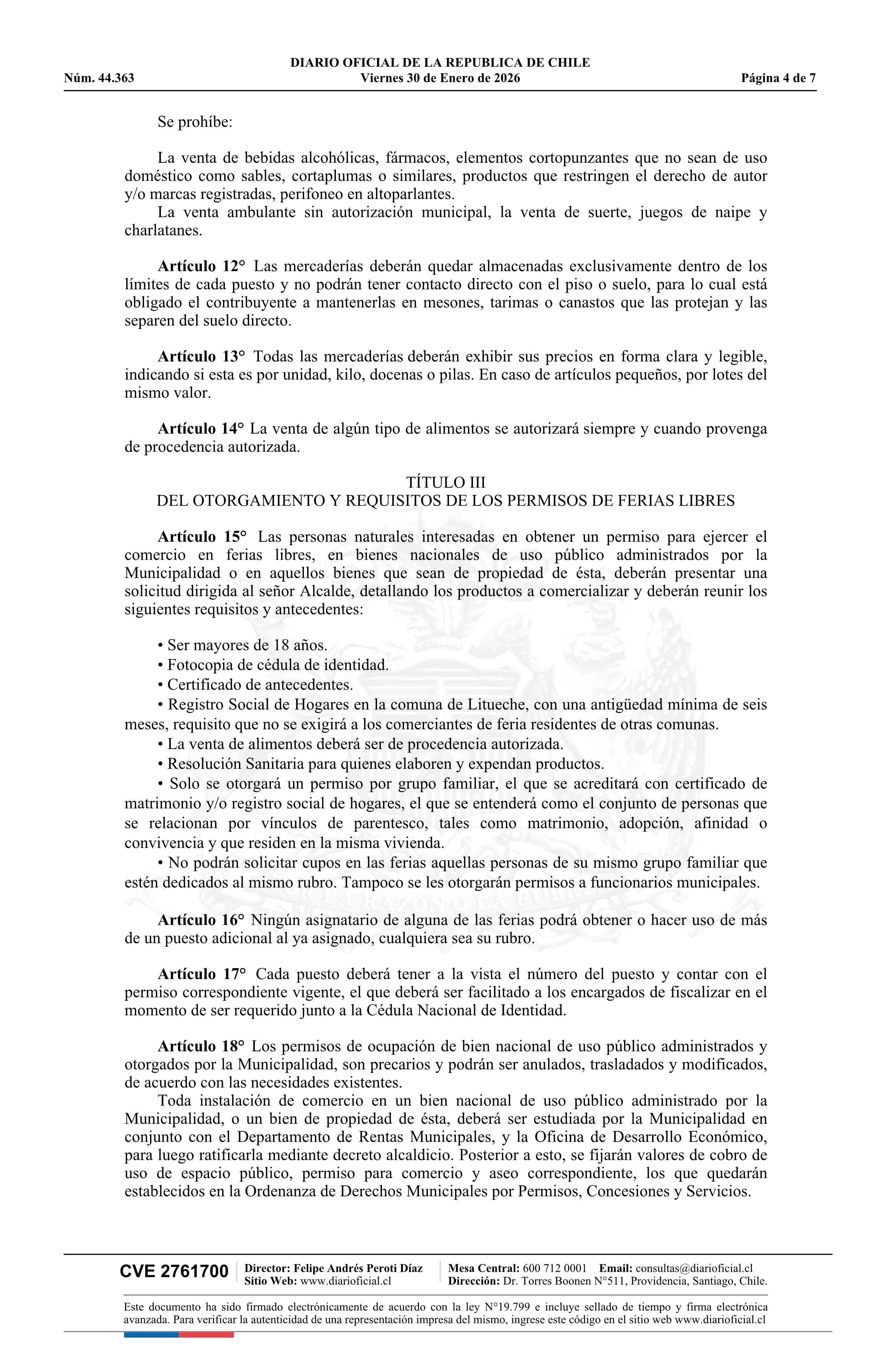 Decreto alcaldicio número 123, de 2026.- Aprueba Ordenanza de Ferias Libres, Comercio Ambulante y Uso de Espacios Públicos 30-01-2026 Diario Oficial Edición Electrónica |