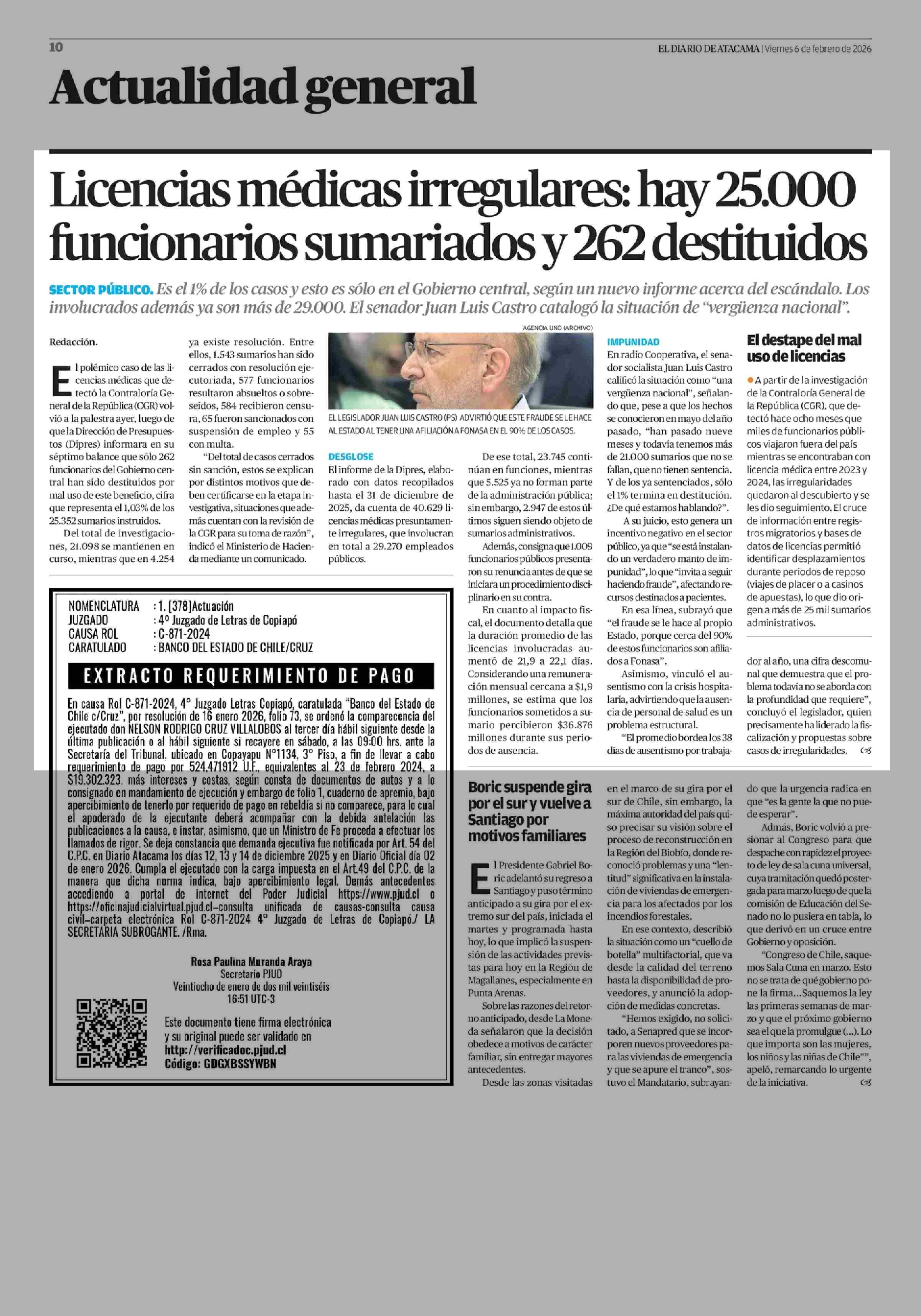 Licencias médicas irregulares: hay 25.000 funcionarios sumariados y 262 destituidos 06-02-2026 El Diario de Atacama |
