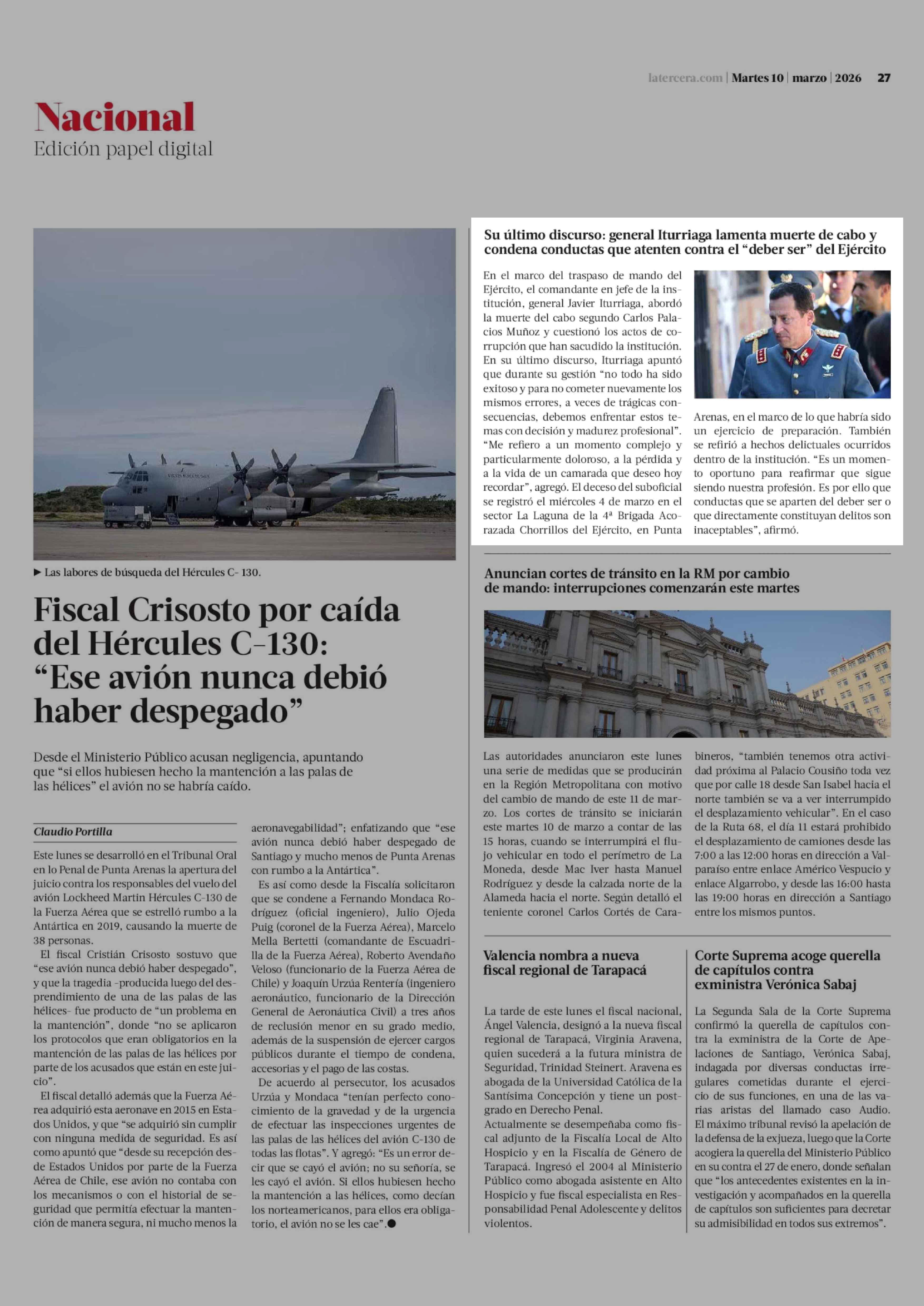 Su último discurso: general Iturriaga lamenta muerte de cabo y condena conductas que atenten contra el "deber ser" del Ejército 10-03-2026 La Tercera |