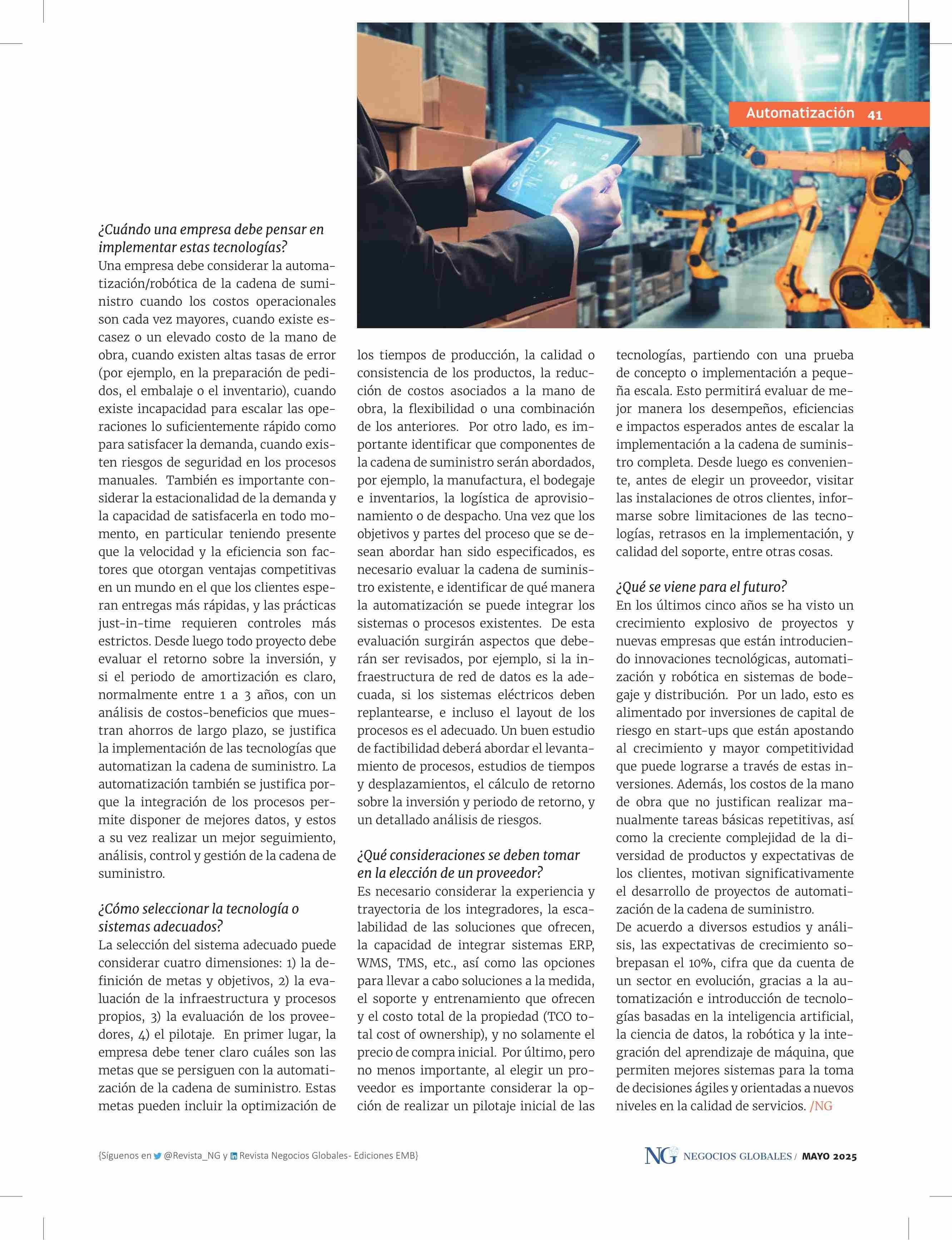 “La automatización y robotización de la cadena de suministro en Chile ha progresado a pasos agigantados” 23-05-2025 Revista NG |