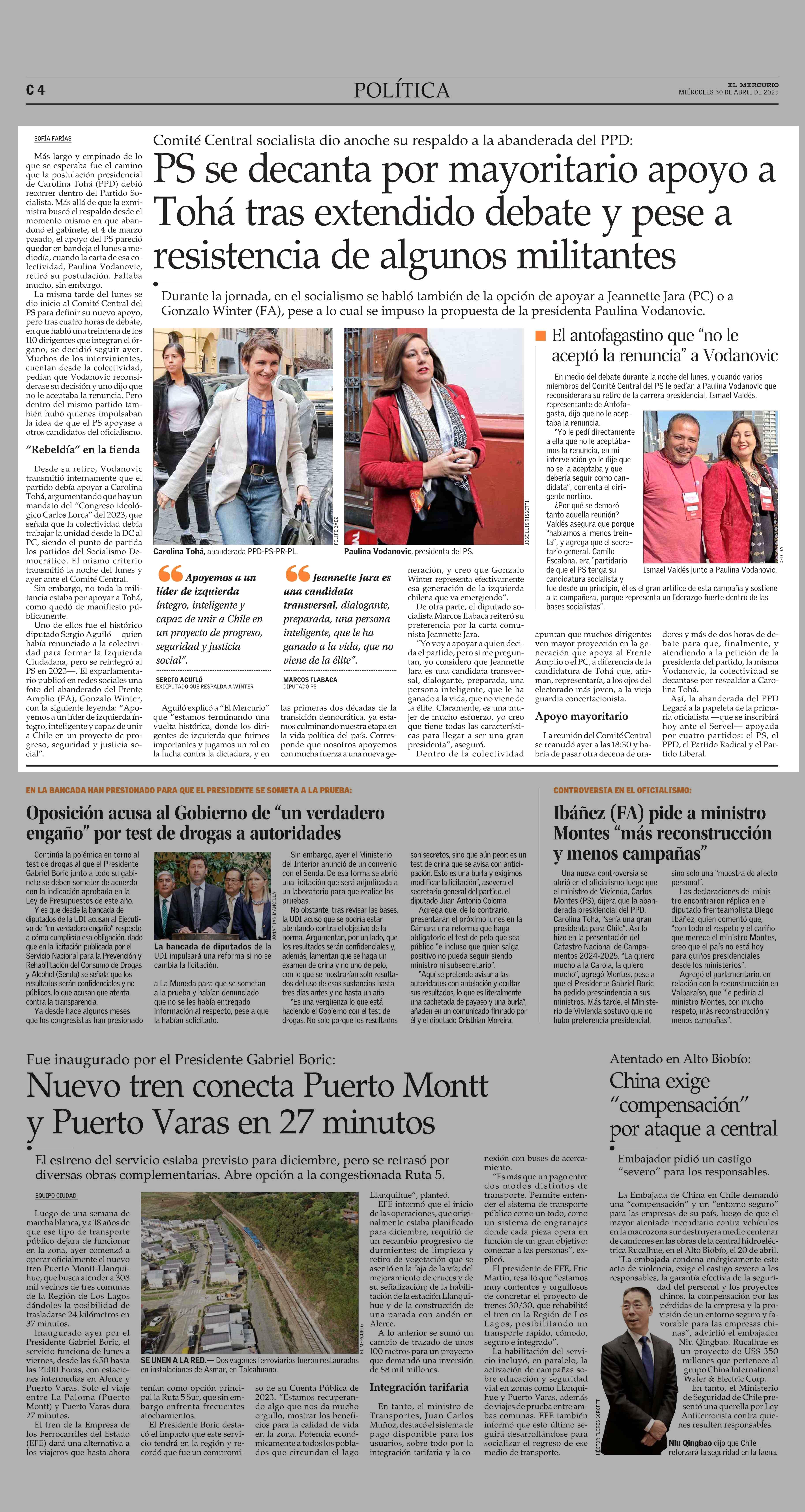 PS se decanta por mayoritario apoyo a Tohá tras extendido debate y pese a resistencia de algunos militantes 30-04-2025 El Mercurio |