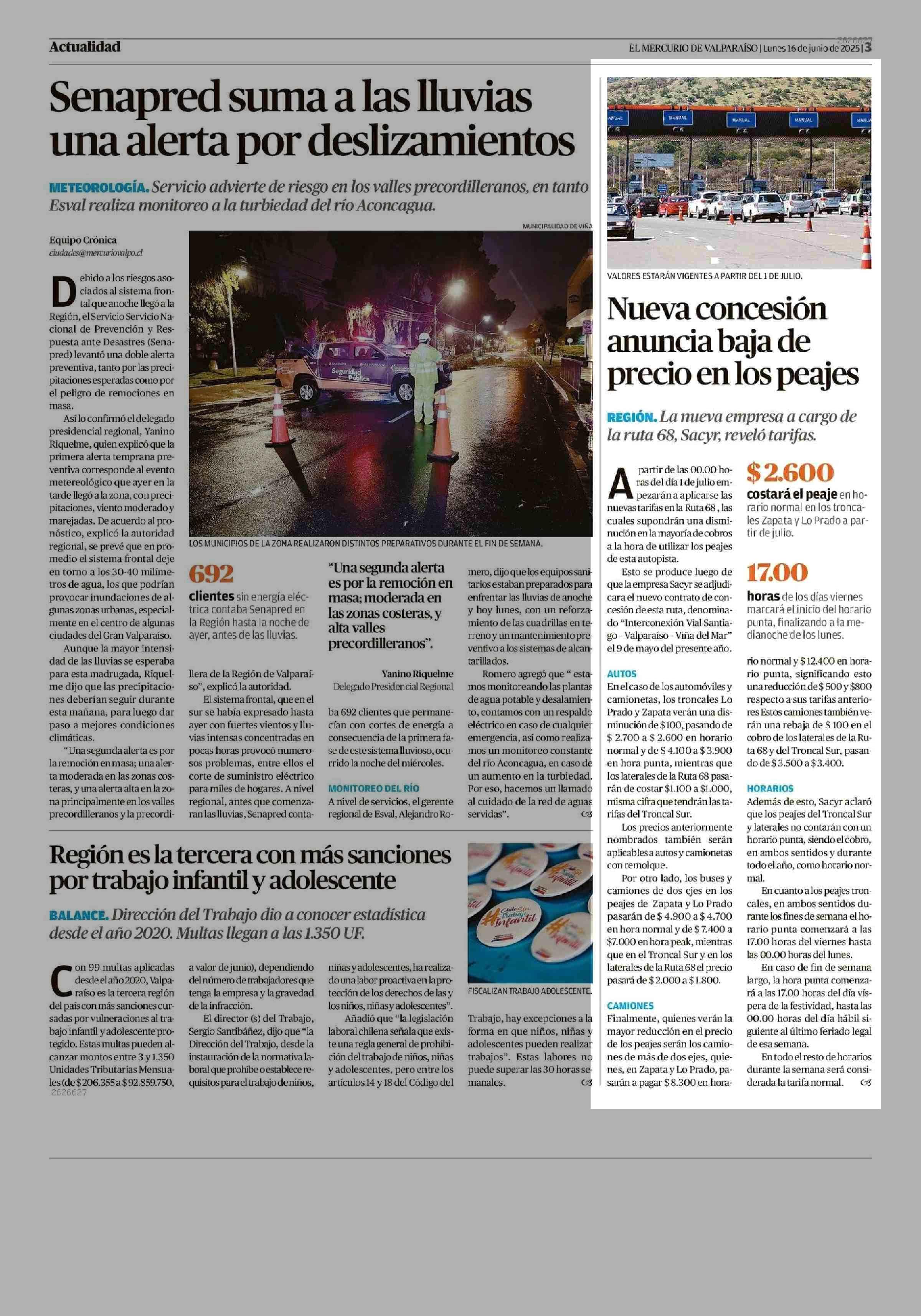 Nueva concesión anuncia baja de precio en los peajes 16-06-2025 El Mercurio de Valparaíso |