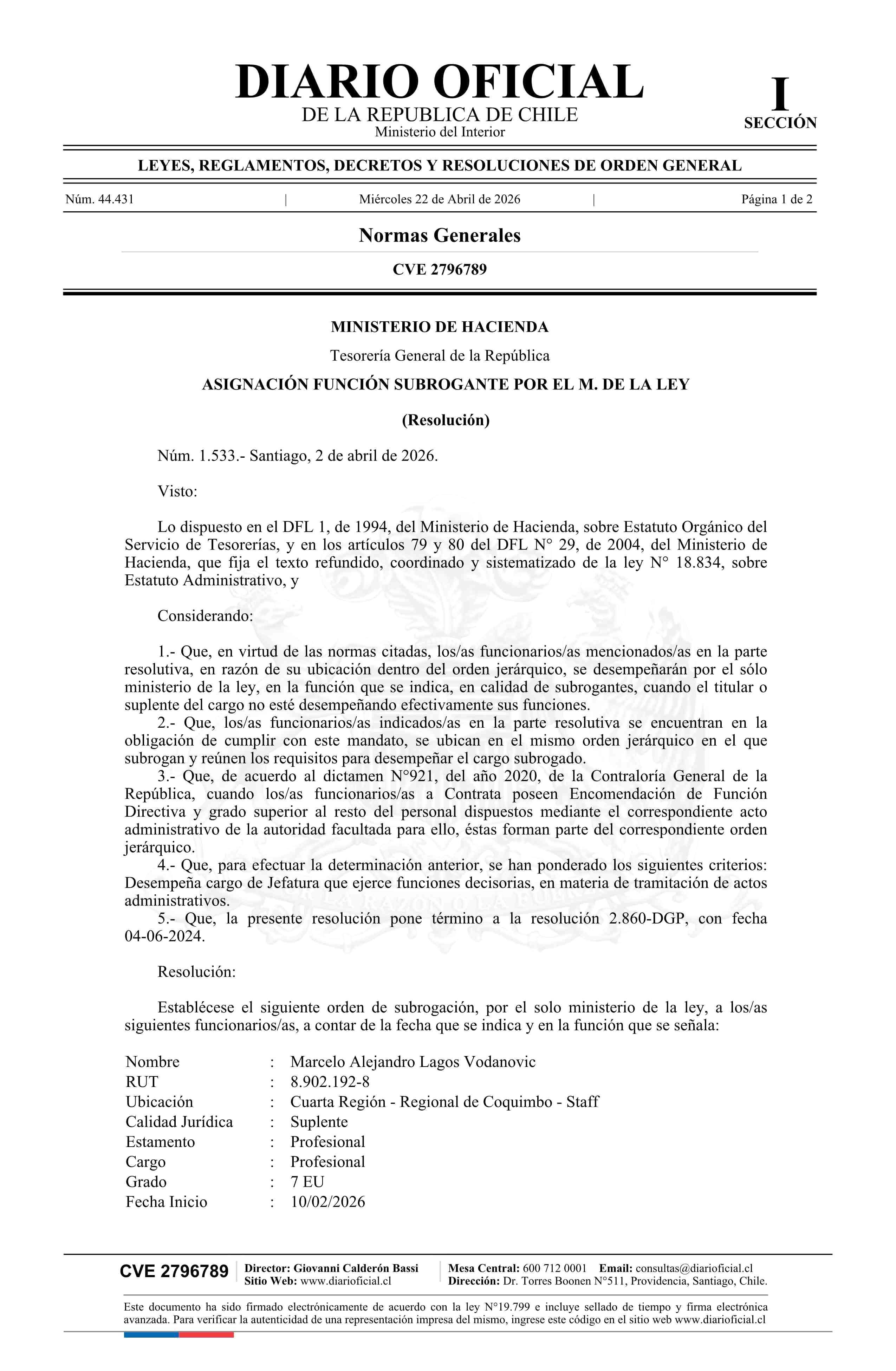 Resolución número 1.533, de 2026.- Asigna orden de subrogación 22-04-2026 Diario Oficial Edición Electrónica |
